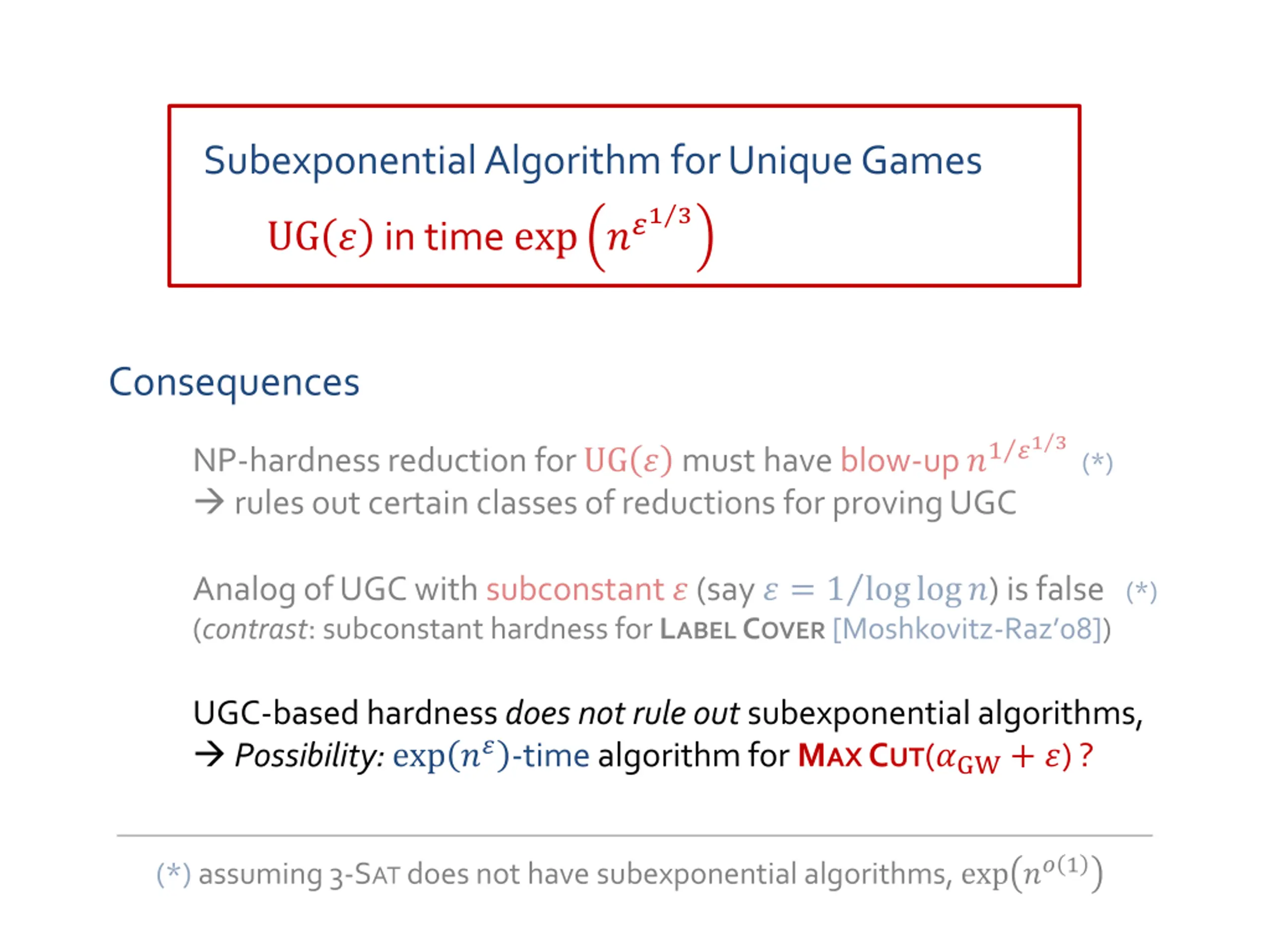 Subexponential Algorithm for Unique Games UG ? in time exp ?? 1 3 Consequences 1 ? 1 3 (*) NP-hardness reduction for UG ? must have blow-up ? rules out certain classes of reductions for proving UGC Analog of UGC with subconstant ? (say ? = (contrast: subconstant hardness for LABEL COVER [Moshkovitz-Raz 08]) 1 loglog?) is false (*) UGC-based hardness does not rule out subexponential algorithms, Possibility:exp ??-time algorithm for MAX CUT(?GW+ ?) ? (*) assuming 3-SAT does not have subexponential algorithms, exp ?? 1