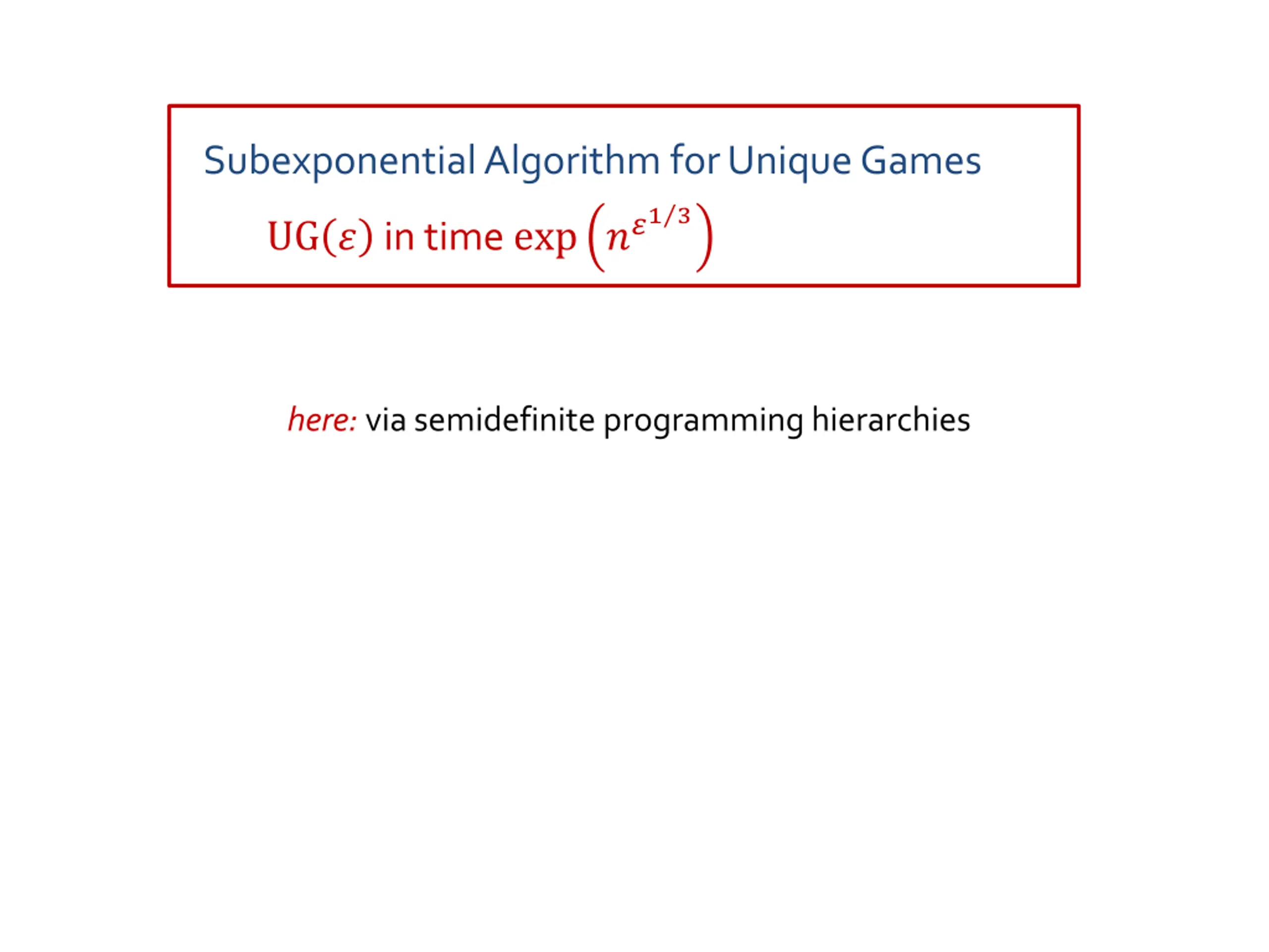 Subexponential Algorithm for Unique Games UG ? in time exp ?? 1 3 here: via semidefinite programming hierarchies