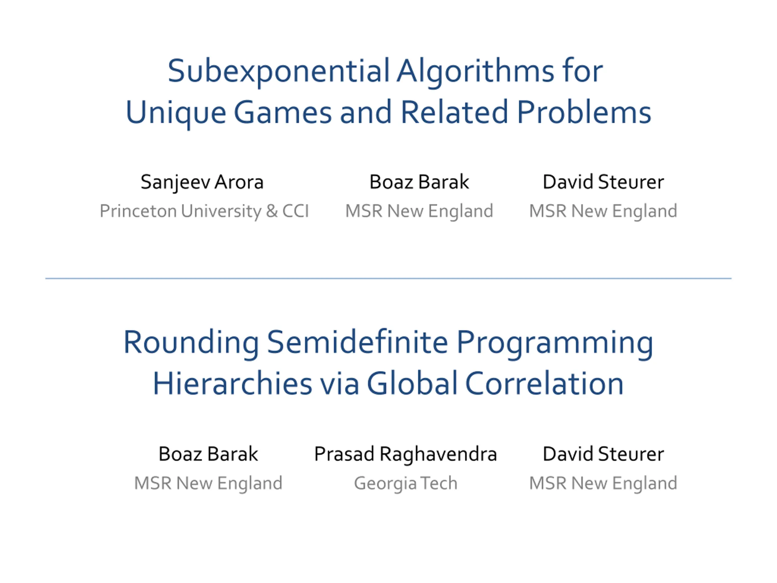 Subexponential Algorithms for Unique Games and Related Problems Sanjeev Arora Princeton University & CCI Boaz Barak MSR New England David Steurer MSR New England Rounding Semidefinite Programming Hierarchies via Global Correlation Boaz Barak MSR New England Prasad Raghavendra Georgia Tech David Steurer MSR New England