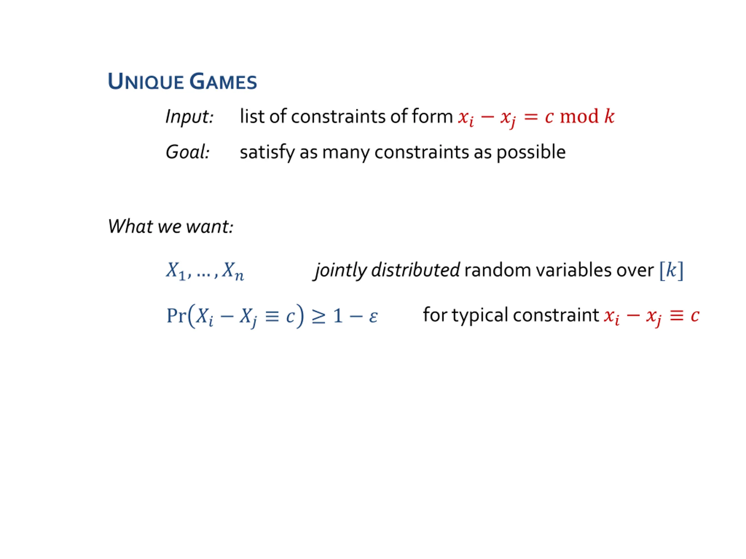 UNIQUE GAMES list of constraints of form ?? ??= ? mod ? Input: Goal: satisfy as many constraints as possible What we want: ?1, ,?? jointly distributed random variables over [?] for typical constraint ?? ?? ? Pr ?? ?? ? 1 ?