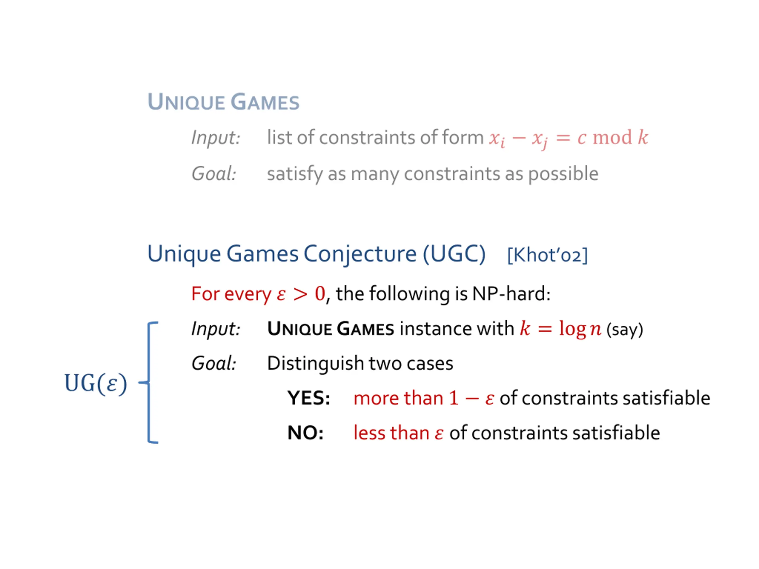 UNIQUE GAMES list of constraints of form ?? ??= ? mod ? Input: Goal: satisfy as many constraints as possible Unique Games Conjecture (UGC) [Khot 02] For every ? > 0, the following is NP-hard: UNIQUE GAMESinstance with ? = log? (say) Input: Goal: Distinguish two cases UG(?) YES: more than 1 ? of constraints satisfiable NO: less than ? of constraints satisfiable