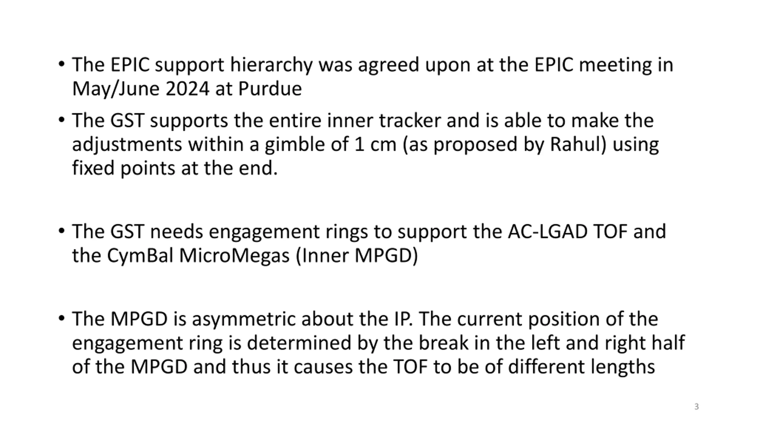 The EPIC support hierarchy was agreed upon at the EPIC meeting in May/June 2024 at Purdue The GST supports the entire inner tracker and is able to make the adjustments within a gimble of 1 cm (as proposed by Rahul) using fixed points at the end. The GST needs engagement rings to support the AC-LGAD TOF and the CymBal MicroMegas (Inner MPGD) The MPGD is asymmetric about the IP. The current position of the engagement ring is determined by the break in the left and right half of the MPGD and thus it causes the TOF to be of different lengths 3