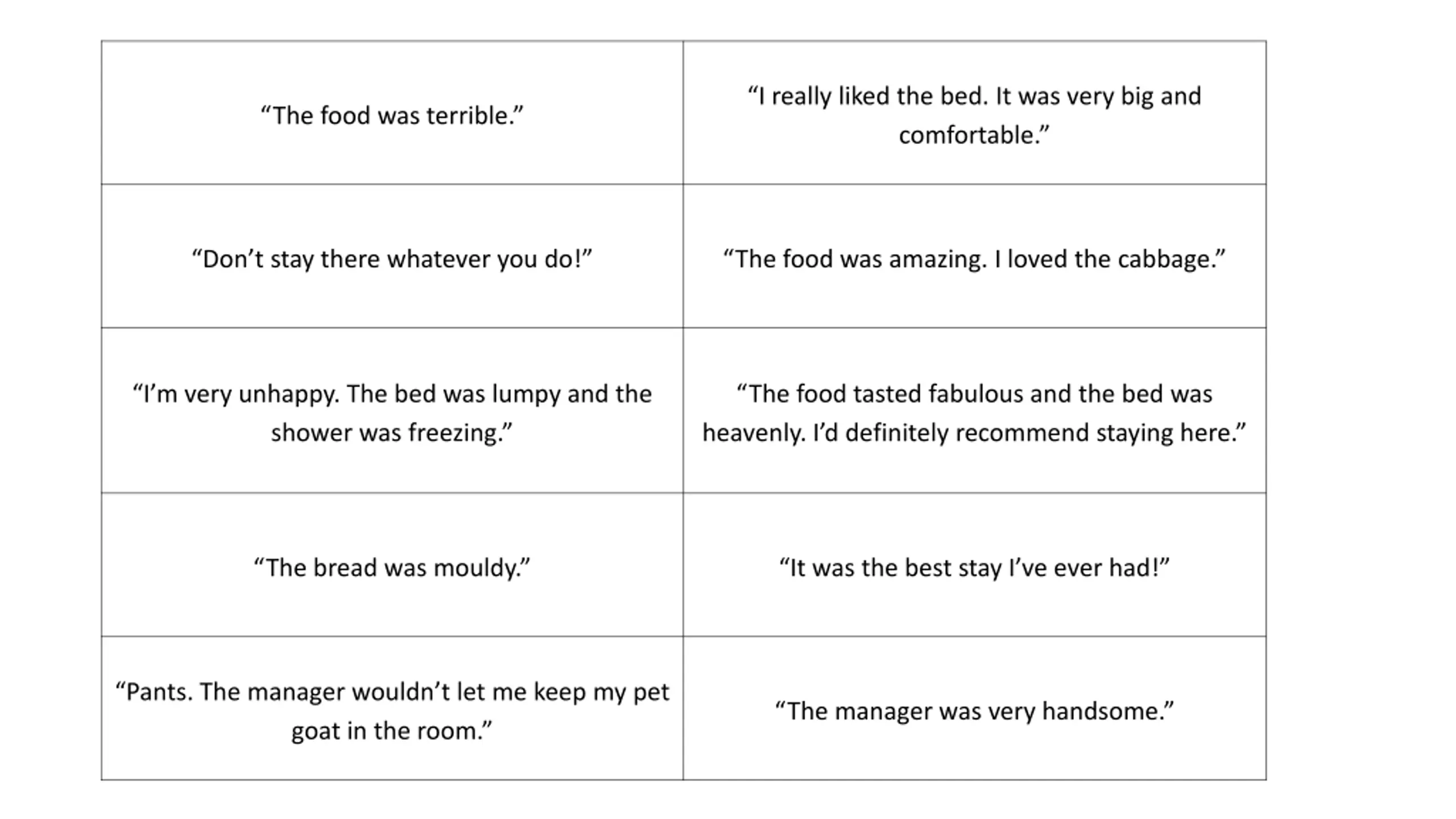 I really liked the bed. It was very big and comfortable. The food was terrible. Don t stay there whatever you do! The food was amazing. I loved the cabbage. I m very unhappy. The bed was lumpy and the shower was freezing. The food tasted fabulous and the bed was heavenly. I d definitely recommend staying here. The bread was mouldy. It was the best stay I ve ever had! Pants. The manager wouldn t let me keep my pet goat in the room. The manager was very handsome.