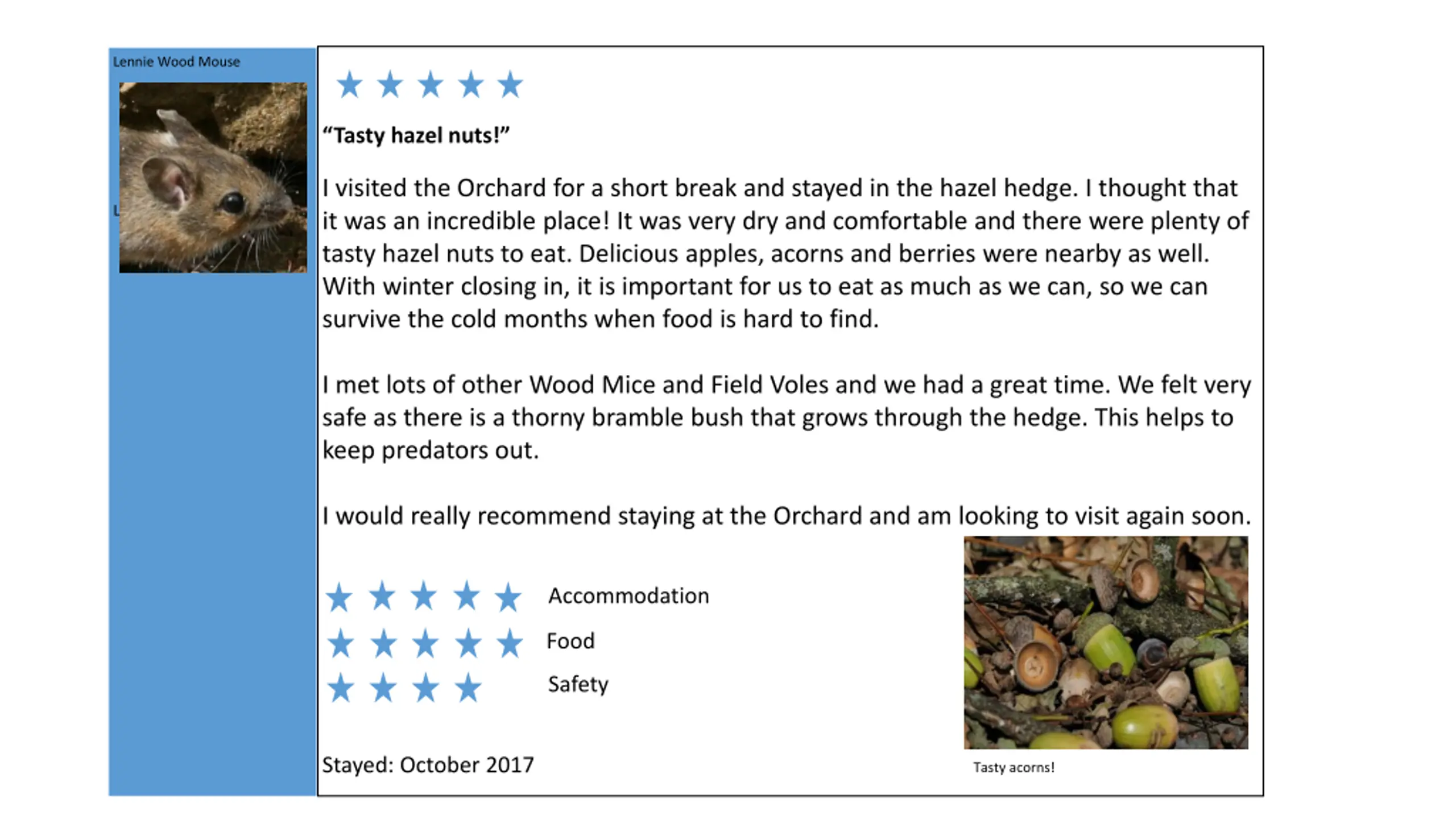 Lennie Wood Mouse Tasty hazel nuts! I visited the Orchard for a short break and stayed in the hazel hedge. I thought that it was an incredible place! It was very dry and comfortable and there were plenty of tasty hazel nuts to eat. Delicious apples, acorns and berries were nearby as well. With winter closing in, it is important for us to eat as much as we can, so we can survive the cold months when food is hard to find. Lennie Wood Mouse I met lots of other Wood Mice and Field Voles and we had a great time. We felt very safe as there is a thorny bramble bush that grows through the hedge. This helps to keep predators out. I would really recommend staying at the Orchard and am looking to visit again soon. Accommodation Food Safety Stayed: October 2017 Tasty acorns!