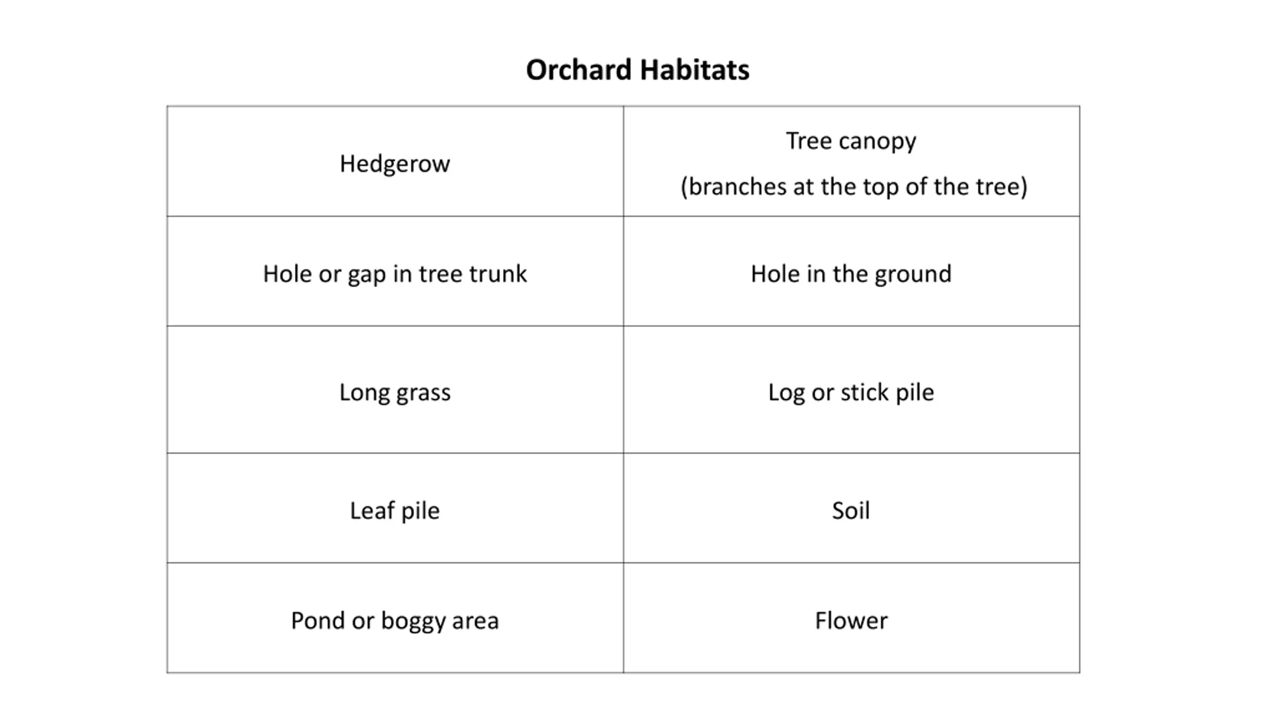 Orchard Habitats Tree canopy Hedgerow (branches at the top of the tree) Hole or gap in tree trunk Hole in the ground Long grass Log or stick pile Leaf pile Soil Pond or boggy area Flower