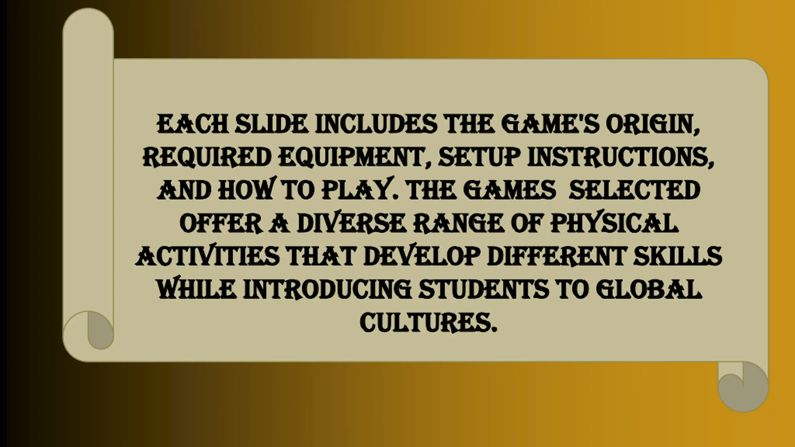 Each slide includes the game's origin, Each slide includes the game's origin, required equipment, setup instructions, required equipment, setup instructions, and how to play. The games selected and how to play. The games selected offer a diverse range of physical offer a diverse range of physical activities that develop different skills activities that develop different skills while introducing students to global while introducing students to global cultures. cultures.