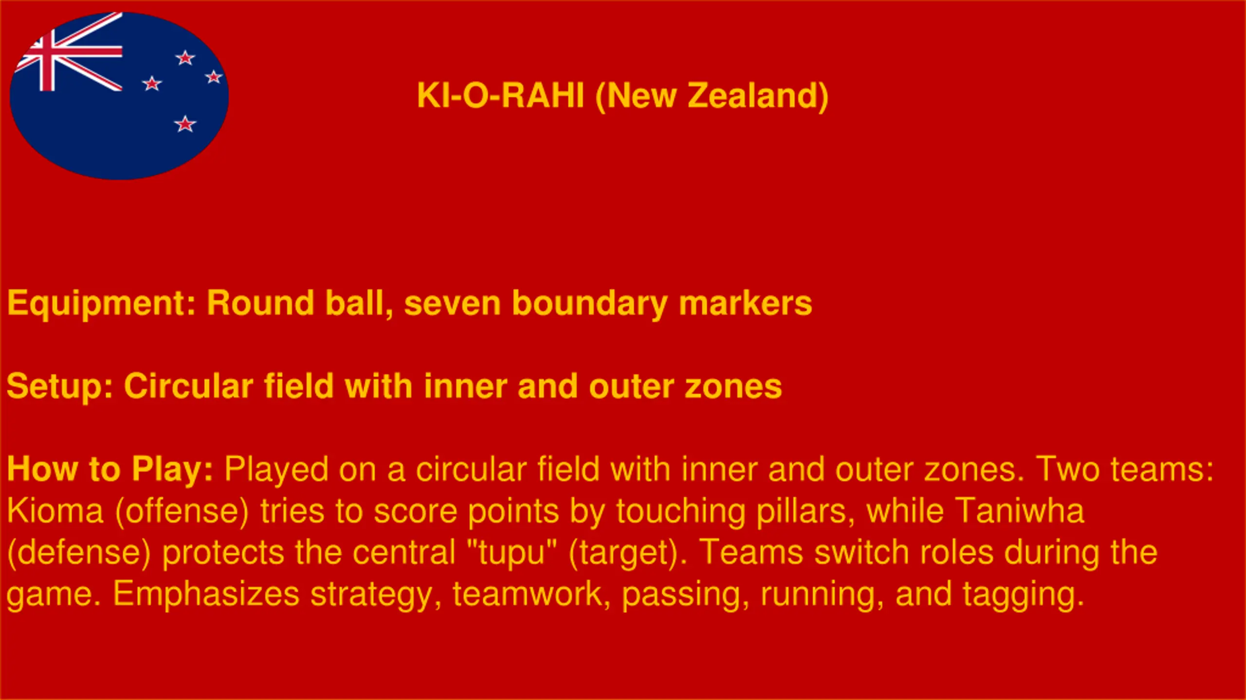 KI-O-RAHI (New Zealand) Equipment: Round ball, seven boundary markers Setup: Circular field with inner and outer zones How to Play: Played on a circular field with inner and outer zones. Two teams: Kioma (offense) tries to score points by touching pillars, while Taniwha (defense) protects the central "tupu" (target). Teams switch roles during the game. Emphasizes strategy, teamwork, passing, running, and tagging.