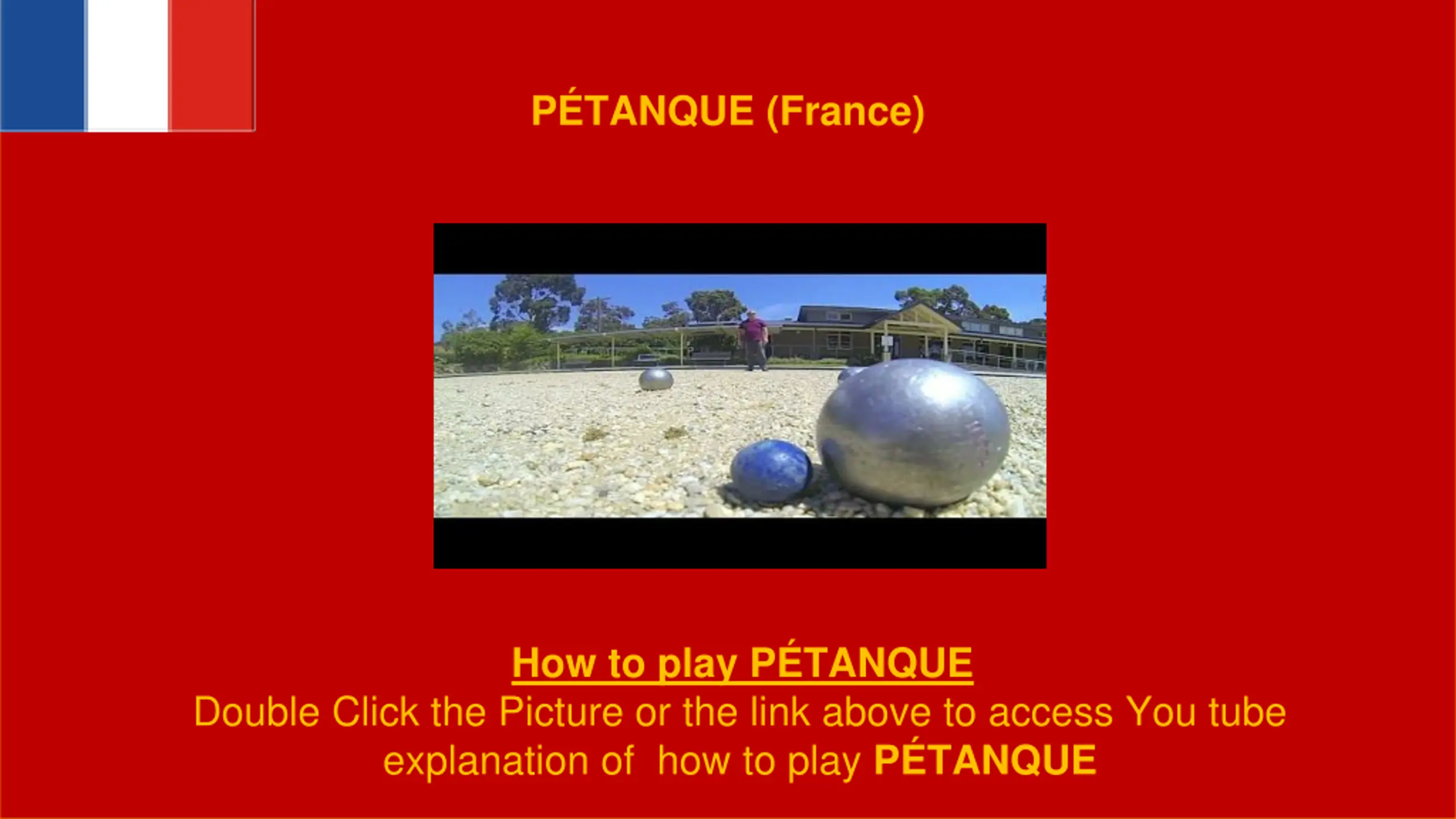 PTANQUE (France) How to play P TANQUE Double Click the Picture or the link above to access You tube explanation of how to play P TANQUE How to play P TANQUE Double Click the Picture or the link above to access You tube explanation of how to play P TANQUE