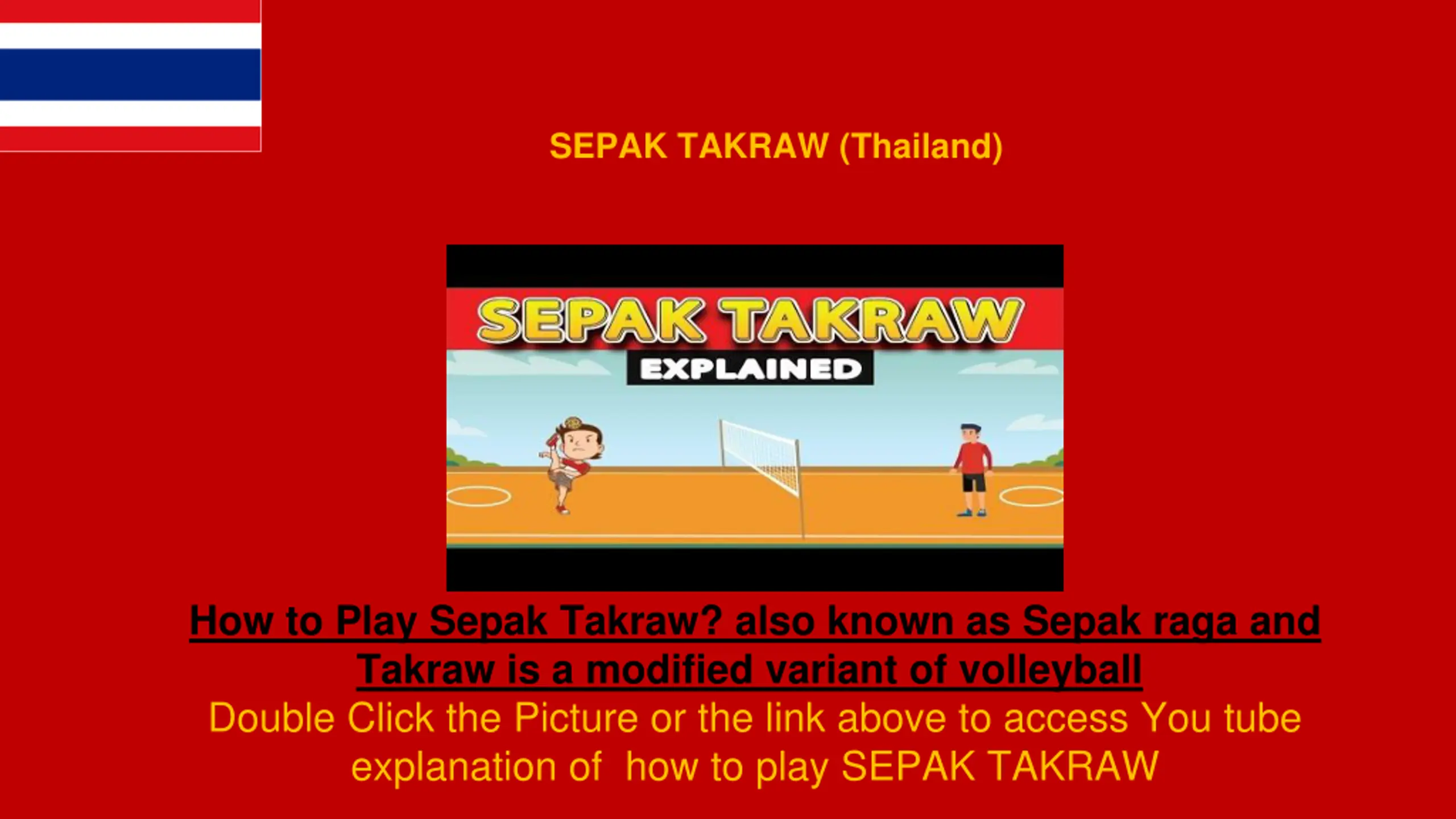 SEPAK TAKRAW (Thailand) How to Play Sepak Takraw? also known as Sepak raga and Takraw is a modified variant of volleyball Double Click the Picture or the link above to access You tube explanation of how to play SEPAK TAKRAW