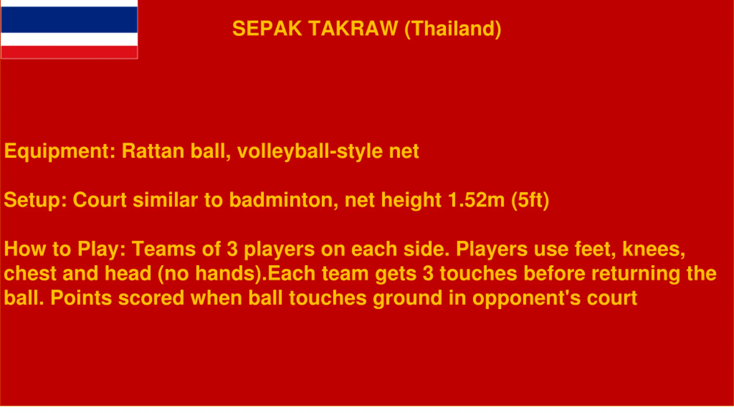 SEPAK TAKRAW (Thailand) Equipment: Rattan ball, volleyball-style net Setup: Court similar to badminton, net height 1.52m (5ft) How to Play: Teams of 3 players on each side. Players use feet, knees, chest and head (no hands).Each team gets 3 touches before returning the ball. Points scored when ball touches ground in opponent's court