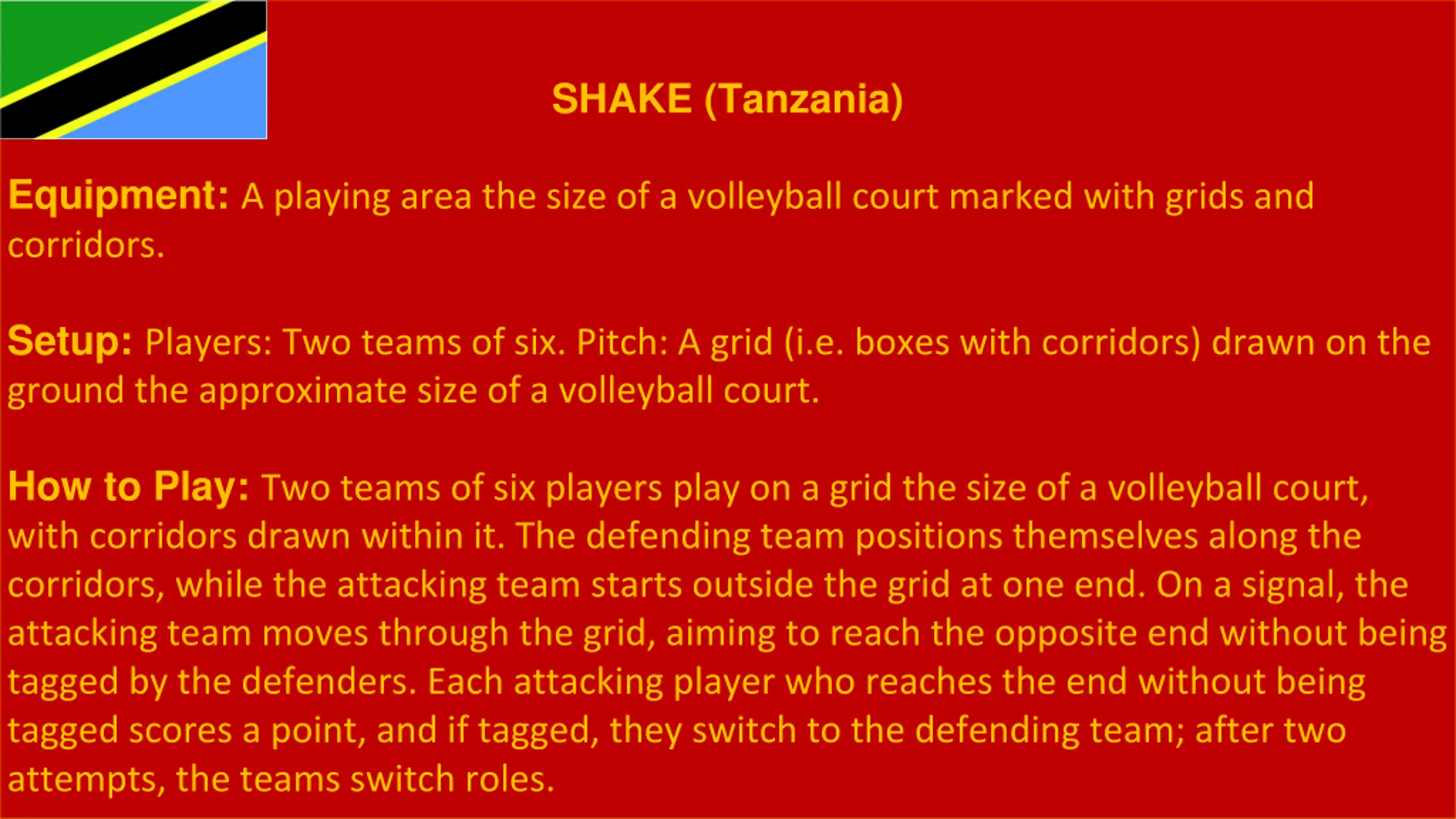 SHAKE (Tanzania) Equipment: A playing area the size of a volleyball court marked with grids and corridors. Setup: Players: Two teams of six. Pitch: A grid (i.e. boxes with corridors) drawn on the ground the approximate size of a volleyball court. How to Play: Two teams of six players play on a grid the size of a volleyball court, with corridors drawn within it. The defending team positions themselves along the corridors, while the attacking team starts outside the grid at one end. On a signal, the attacking team moves through the grid, aiming to reach the opposite end without being tagged by the defenders. Each attacking player who reaches the end without being tagged scores a point, and if tagged, they switch to the defending team; after two attempts, the teams switch roles.