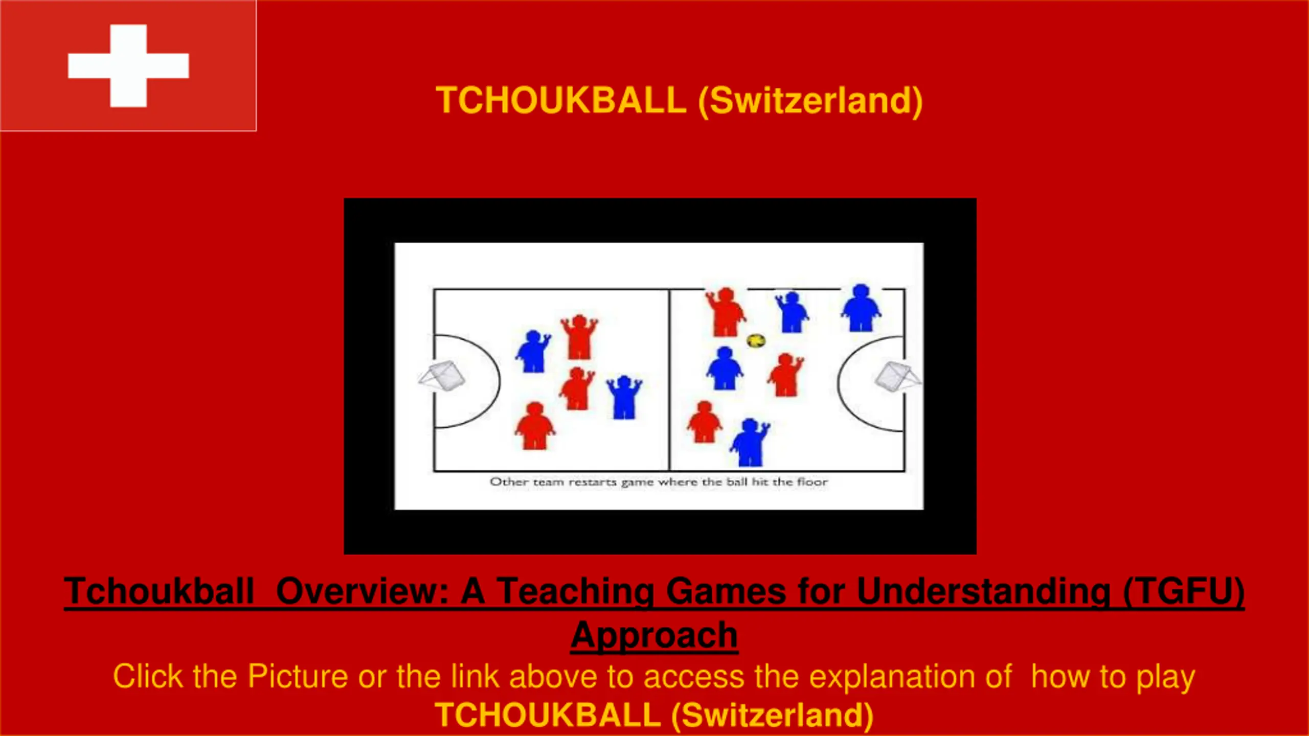 TCHOUKBALL (Switzerland) Tchoukball Overview: A Teaching Games for Understanding (TGFU) Approach Click the Picture or the link above to access the explanation of how to play TCHOUKBALL (Switzerland)