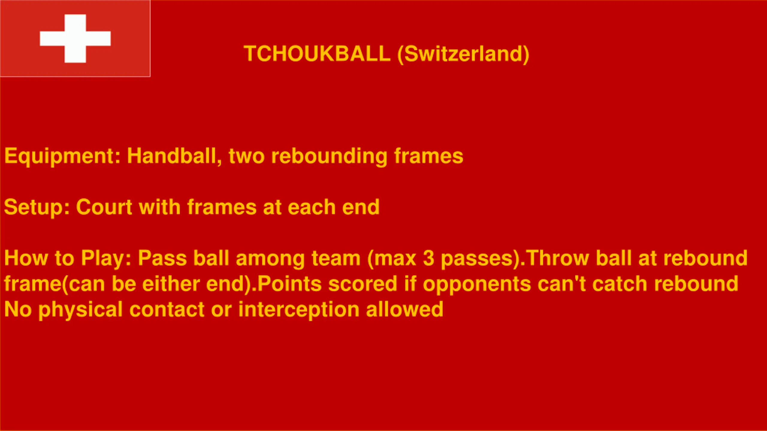 TCHOUKBALL (Switzerland) Equipment: Handball, two rebounding frames Setup: Court with frames at each end How to Play: Pass ball among team (max 3 passes).Throw ball at rebound frame(can be either end).Points scored if opponents can't catch rebound No physical contact or interception allowed