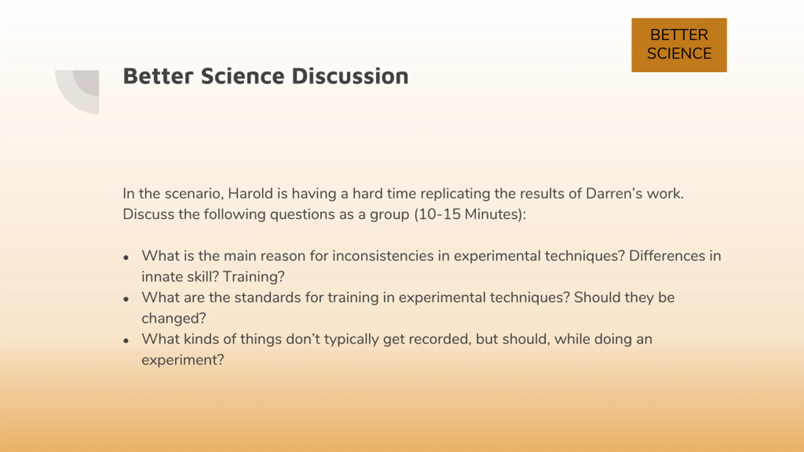 BETTER SCIENCE Better Science Discussion In the scenario, Harold is having a hard time replicating the results of Darren s work. Discuss the following questions as a group (10-15 Minutes): What is the main reason for inconsistencies in experimental techniques? Differences in innate skill? Training? What are the standards for training in experimental techniques? Should they be changed? What kinds of things don t typically get recorded, but should, while doing an experiment?