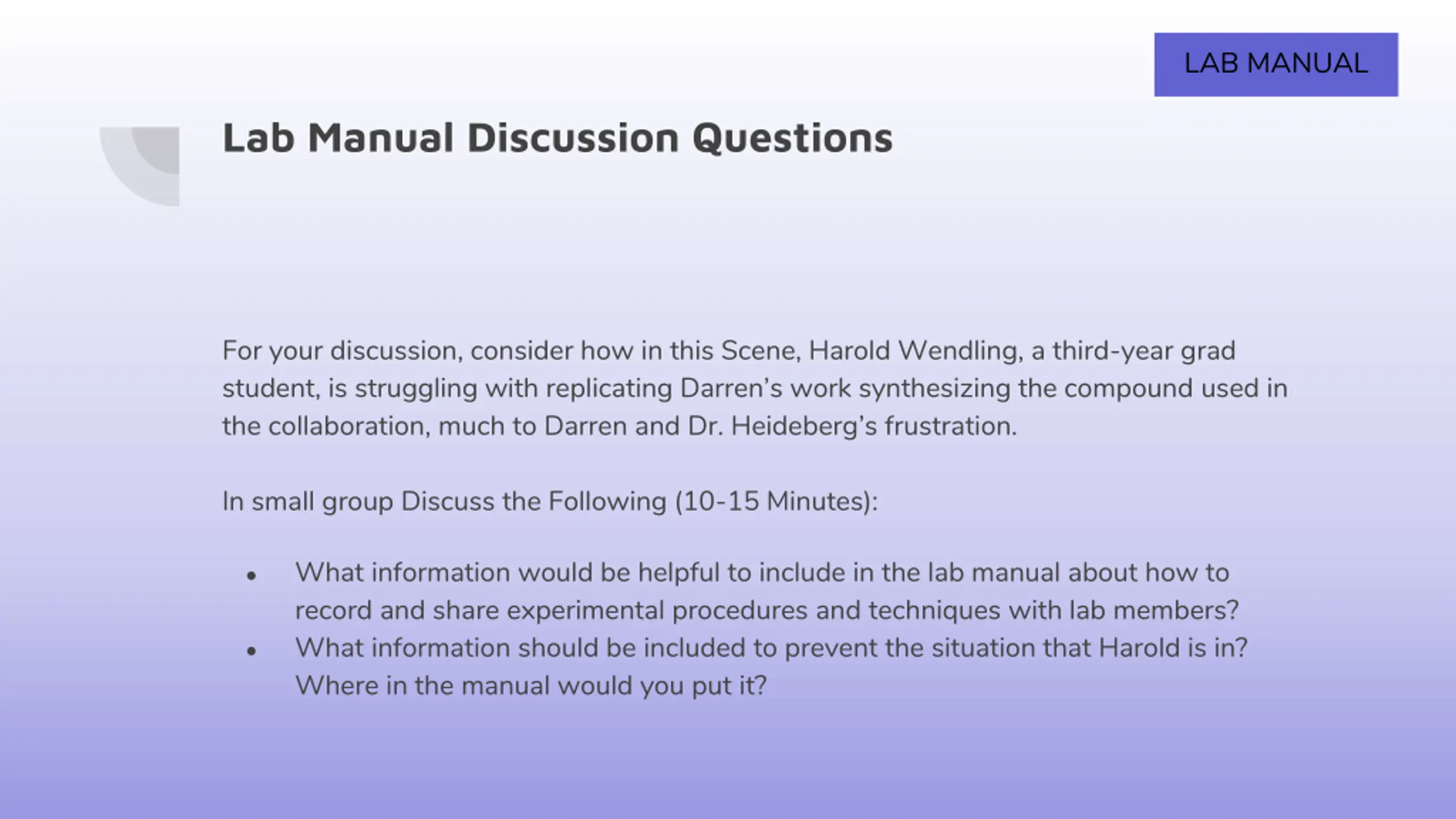 LAB MANUAL Lab Manual Discussion Questions For your discussion, consider how in this Scene, Harold Wendling, a third-year grad student, is struggling with replicating Darren s work synthesizing the compound used in the collaboration, much to Darren and Dr. Heideberg s frustration. In small group Discuss the Following (10-15 Minutes): What information would be helpful to include in the lab manual about how to record and share experimental procedures and techniques with lab members? What information should be included to prevent the situation that Harold is in? Where in the manual would you put it?