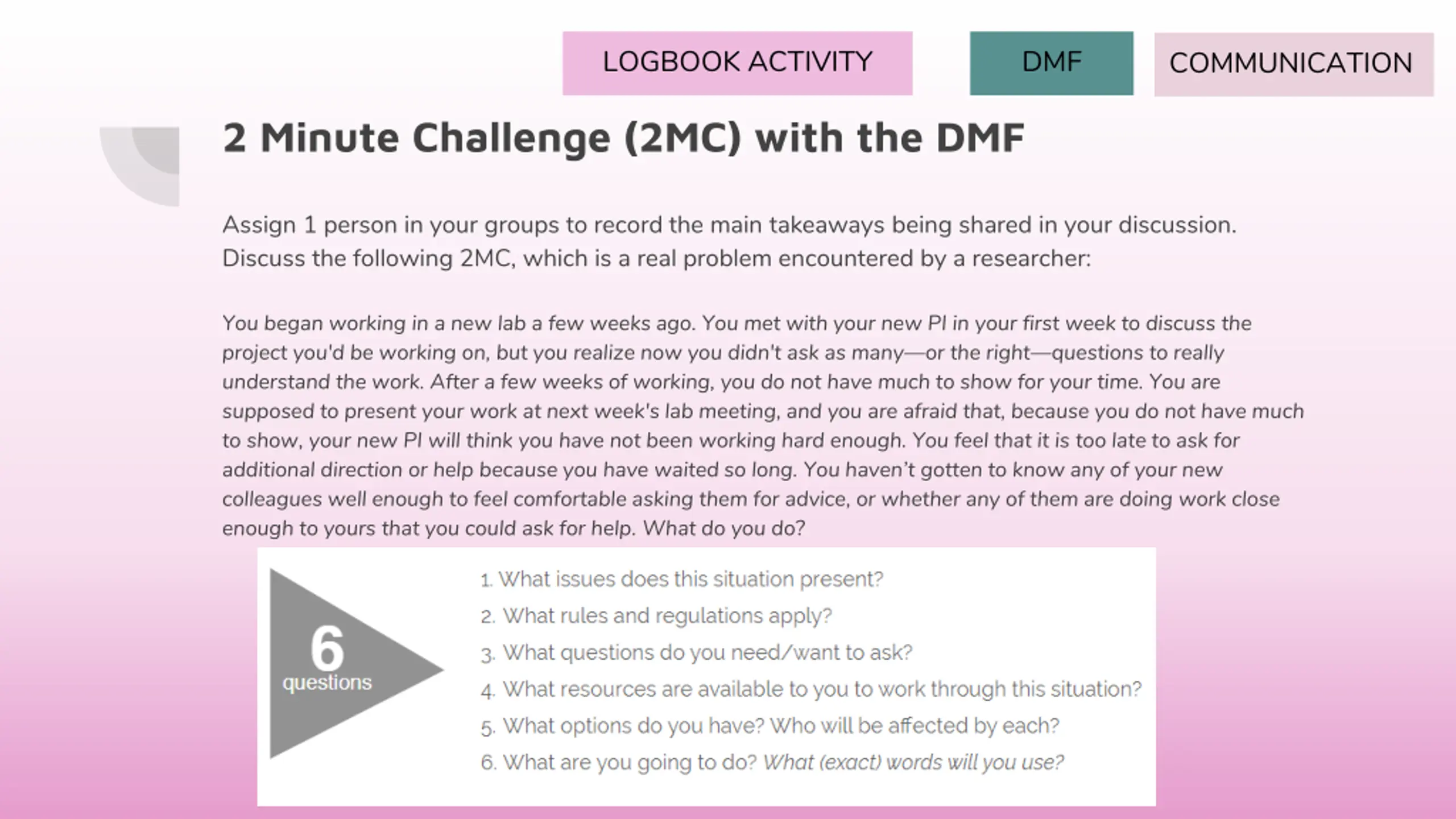LOGBOOK ACTIVITY DMF COMMUNICATION 2 Minute Challenge (2MC) with the DMF Assign 1 person in your groups to record the main takeaways being shared in your discussion. Discuss the following 2MC, which is a real problem encountered by a researcher: You began working in a new lab a few weeks ago. You met with your new PI in your first week to discuss the project you'd be working on, but you realize now you didn't ask as many or the right questions to really understand the work. After a few weeks of working, you do not have much to show for your time. You are supposed to present your work at next week's lab meeting, and you are afraid that, because you do not have much to show, your new PI will think you have not been working hard enough. You feel that it is too late to ask for additional direction or help because you have waited so long. You haven t gotten to know any of your new colleagues well enough to feel comfortable asking them for advice, or whether any of them are doing work close enough to yours that you could ask for help. What do you do?