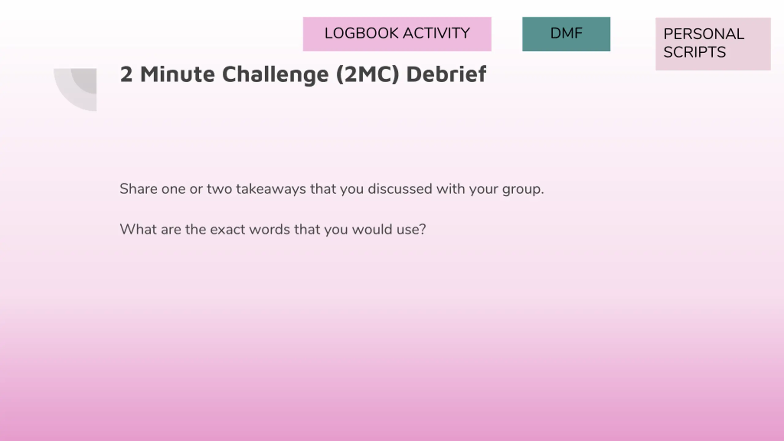 LOGBOOK ACTIVITY DMF PERSONAL SCRIPTS 2 Minute Challenge (2MC) Debrief Share one or two takeaways that you discussed with your group. What are the exact words that you would use?