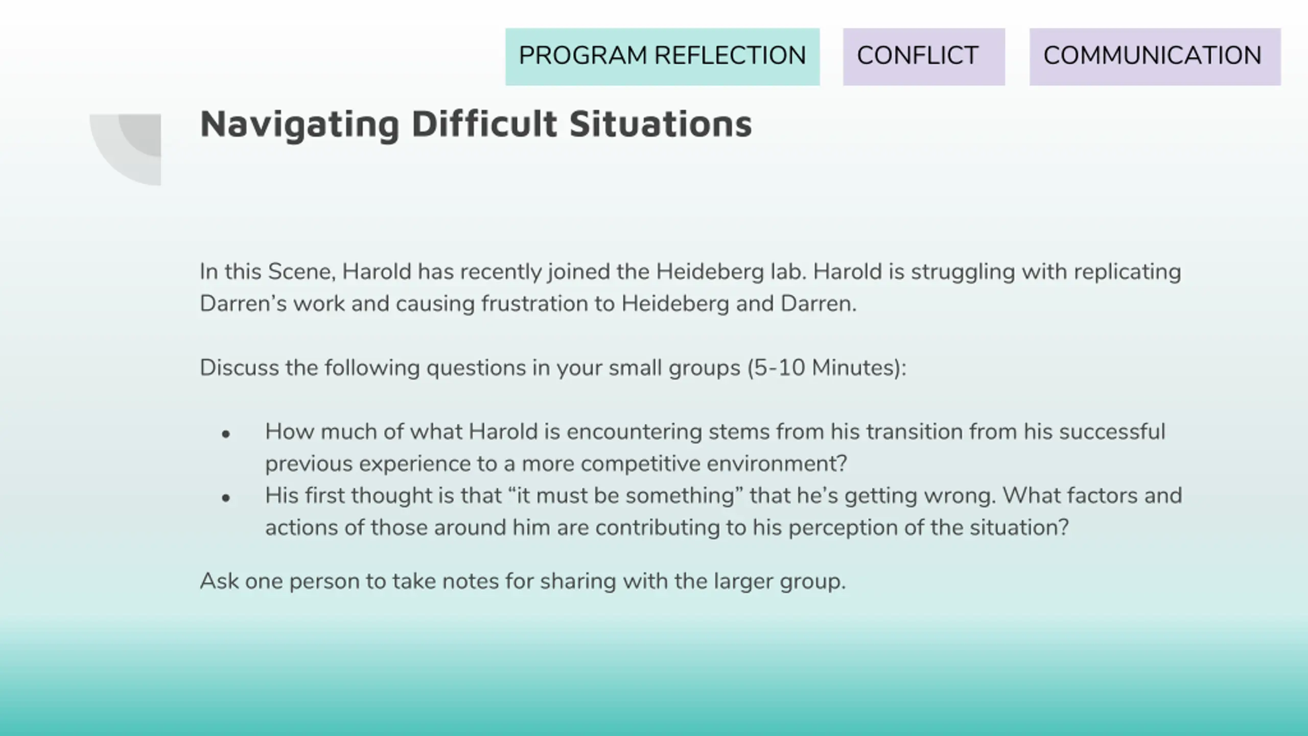 PROGRAM REFLECTION CONFLICT COMMUNICATION Navigating Difficult Situations In this Scene, Harold has recently joined the Heideberg lab. Harold is struggling with replicating Darren s work and causing frustration to Heideberg and Darren. Discuss the following questions in your small groups (5-10 Minutes): How much of what Harold is encountering stems from his transition from his successful previous experience to a more competitive environment? His first thought is that it must be something that he s getting wrong. What factors and actions of those around him are contributing to his perception of the situation? Ask one person to take notes for sharing with the larger group.