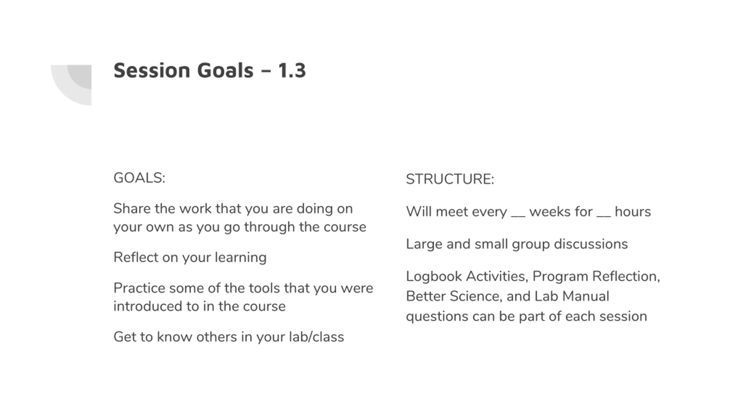 Session Goals 1.3 GOALS: STRUCTURE: Share the work that you are doing on your own as you go through the course Will meet every __ weeks for __ hours Large and small group discussions Reflect on your learning Logbook Activities, Program Reflection, Better Science, and Lab Manual questions can be part of each session Practice some of the tools that you were introduced to in the course Get to know others in your lab/class