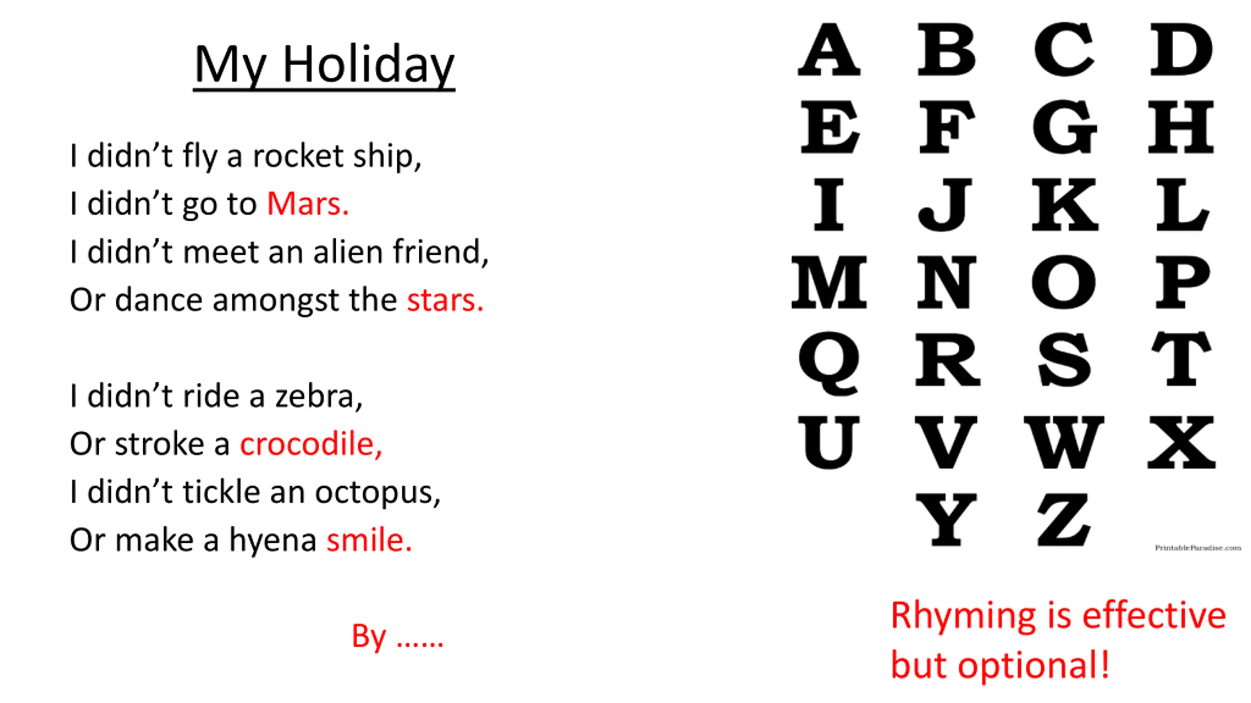 My Holiday I didn t fly a rocket ship, I didn t go to Mars. I didn t meet an alien friend, Or dance amongst the stars. I didn t ride a zebra, Or stroke a crocodile, I didn t tickle an octopus, Or make a hyena smile. Rhyming is effective but optional! By