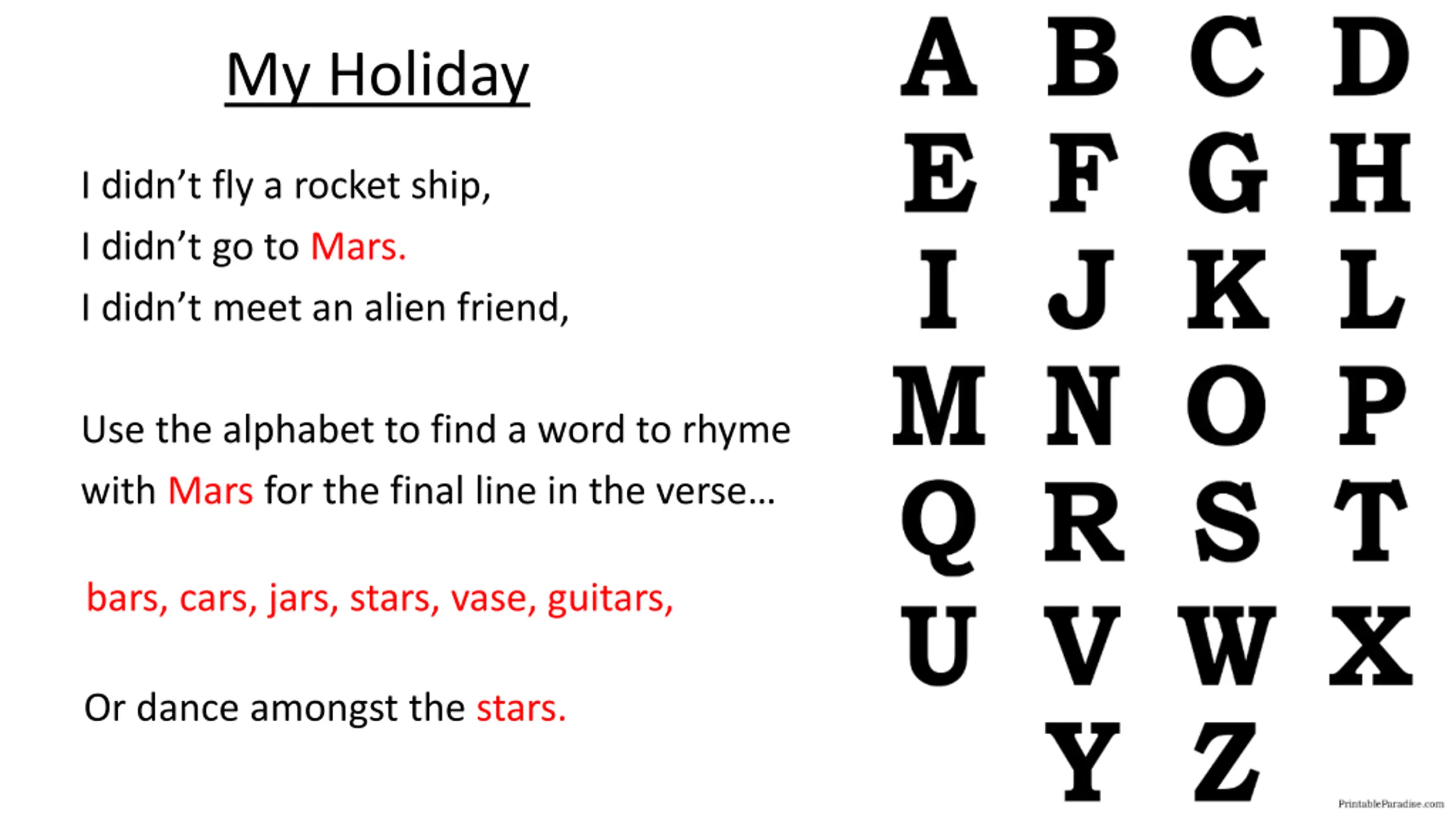 My Holiday I didn t fly a rocket ship, I didn t go to Mars. I didn t meet an alien friend, Rhyming is effective but optional! Use the alphabet to find a word to rhyme with Mars for the final line in the verse bars, cars, jars, stars, vase, guitars, Or dance amongst the stars.