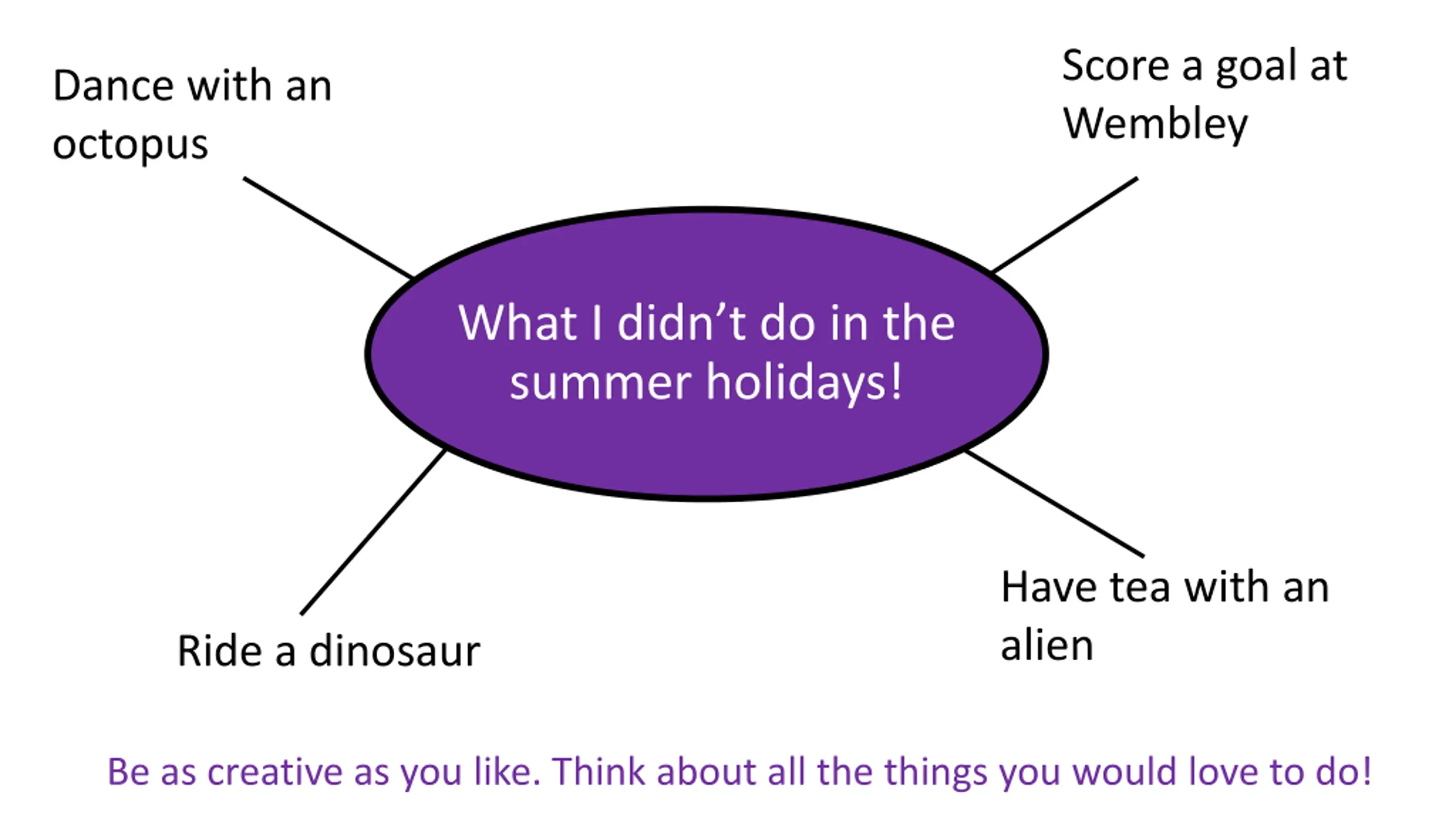 Score a goal at Wembley Dance with an octopus What I didn t do in the summer holidays! Have tea with an alien Ride a dinosaur Be as creative as you like. Think about all the things you would love to do!