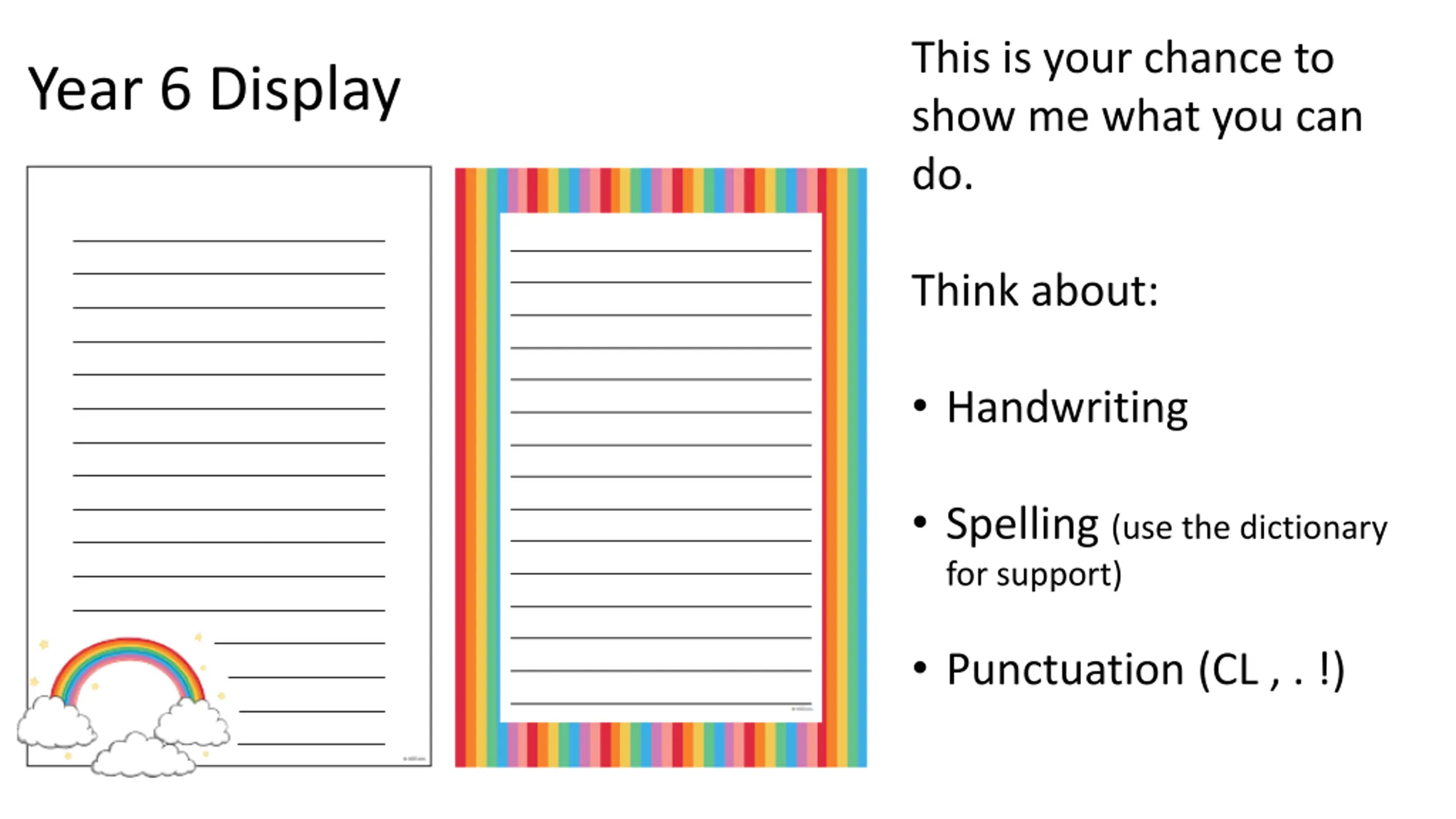This is your chance to show me what you can do. Year 6 Display Think about: Handwriting Spelling (use the dictionary for support) Punctuation (CL , . !)