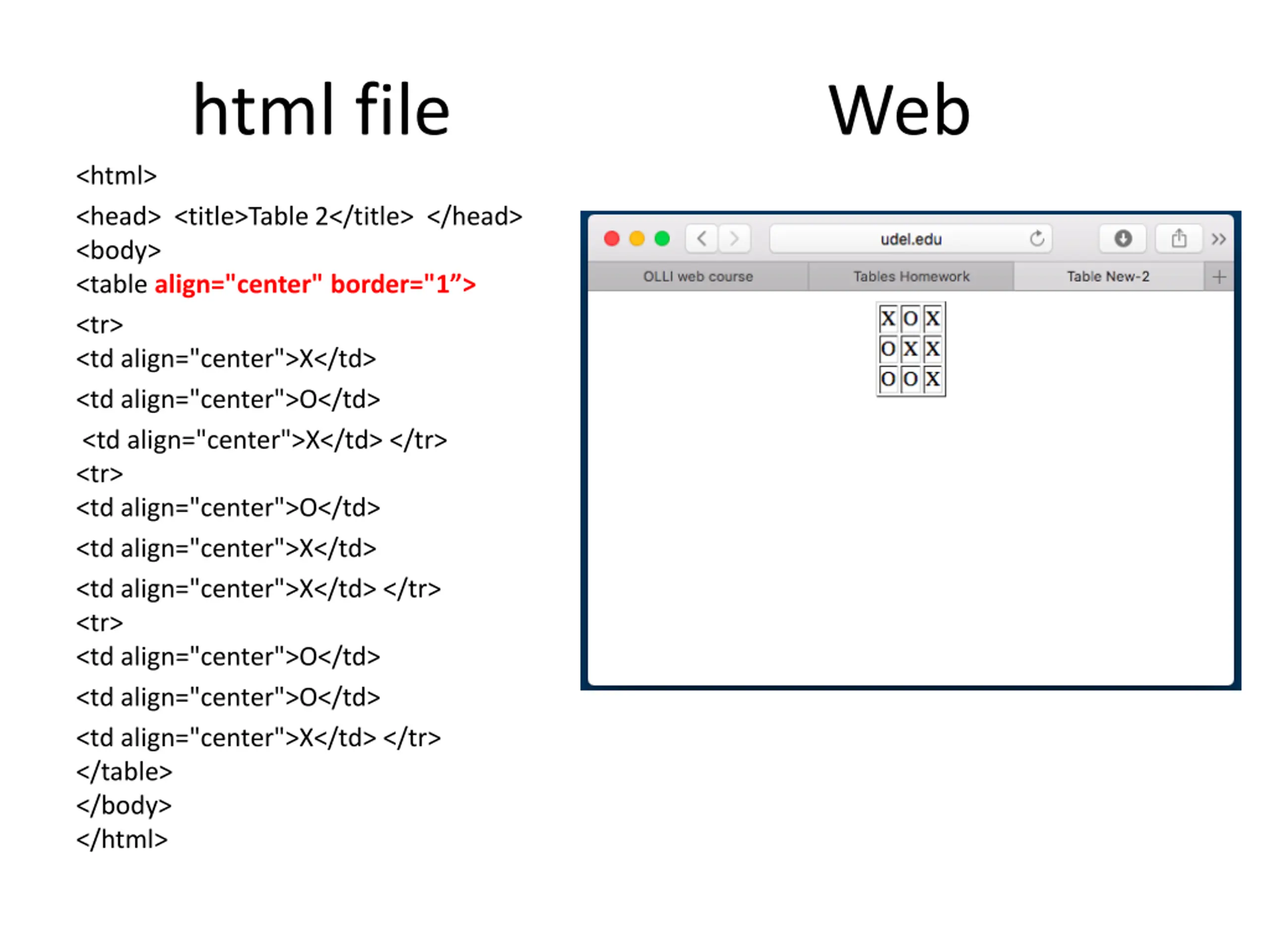 html file Web <html> <head> <title>Table 2</title> </head> <body> <table align="center" border="1 > <tr> <td align="center">X</td> <td align="center">O</td> <td align="center">X</td> </tr> <tr> <td align="center">O</td> <td align="center">X</td> <td align="center">X</td> </tr> <tr> <td align="center">O</td> <td align="center">O</td> <td align="center">X</td> </tr> </table> </body> </html>
