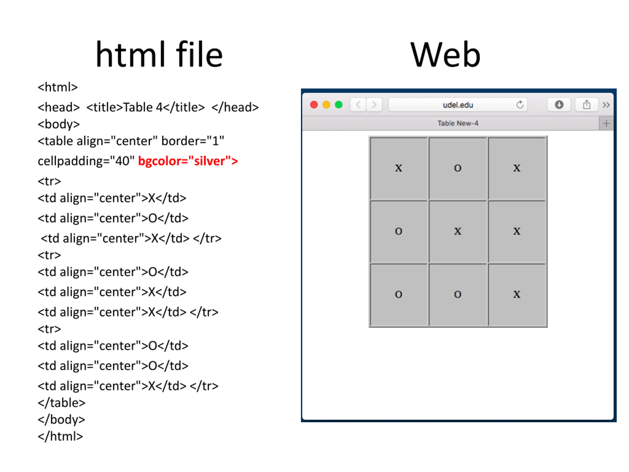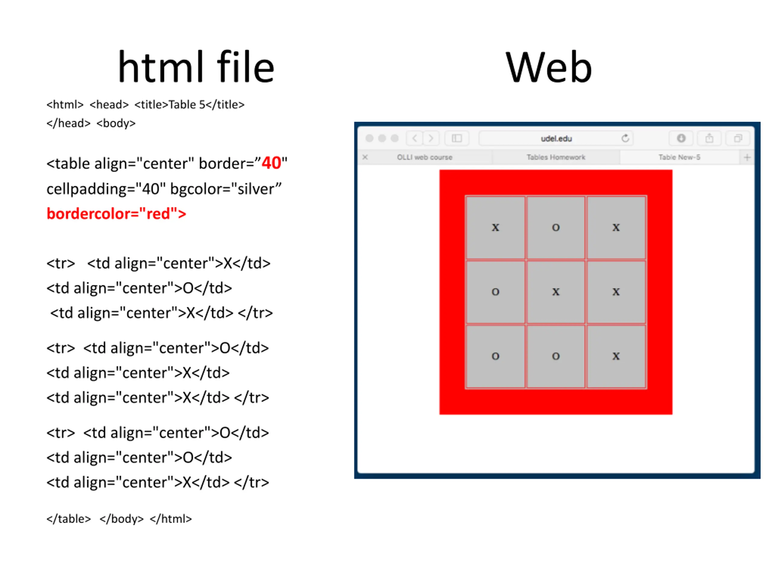 html file <html> <head> <title>Table 5</title> </head> <body> Web <table align="center" border= 40" cellpadding="40" bgcolor="silver bordercolor="red"> <tr> <td align="center">X</td> <td align="center">O</td> <td align="center">X</td> </tr> <tr> <td align="center">O</td> <td align="center">X</td> <td align="center">X</td> </tr> <tr> <td align="center">O</td> <td align="center">O</td> <td align="center">X</td> </tr> </table> </body> </html>