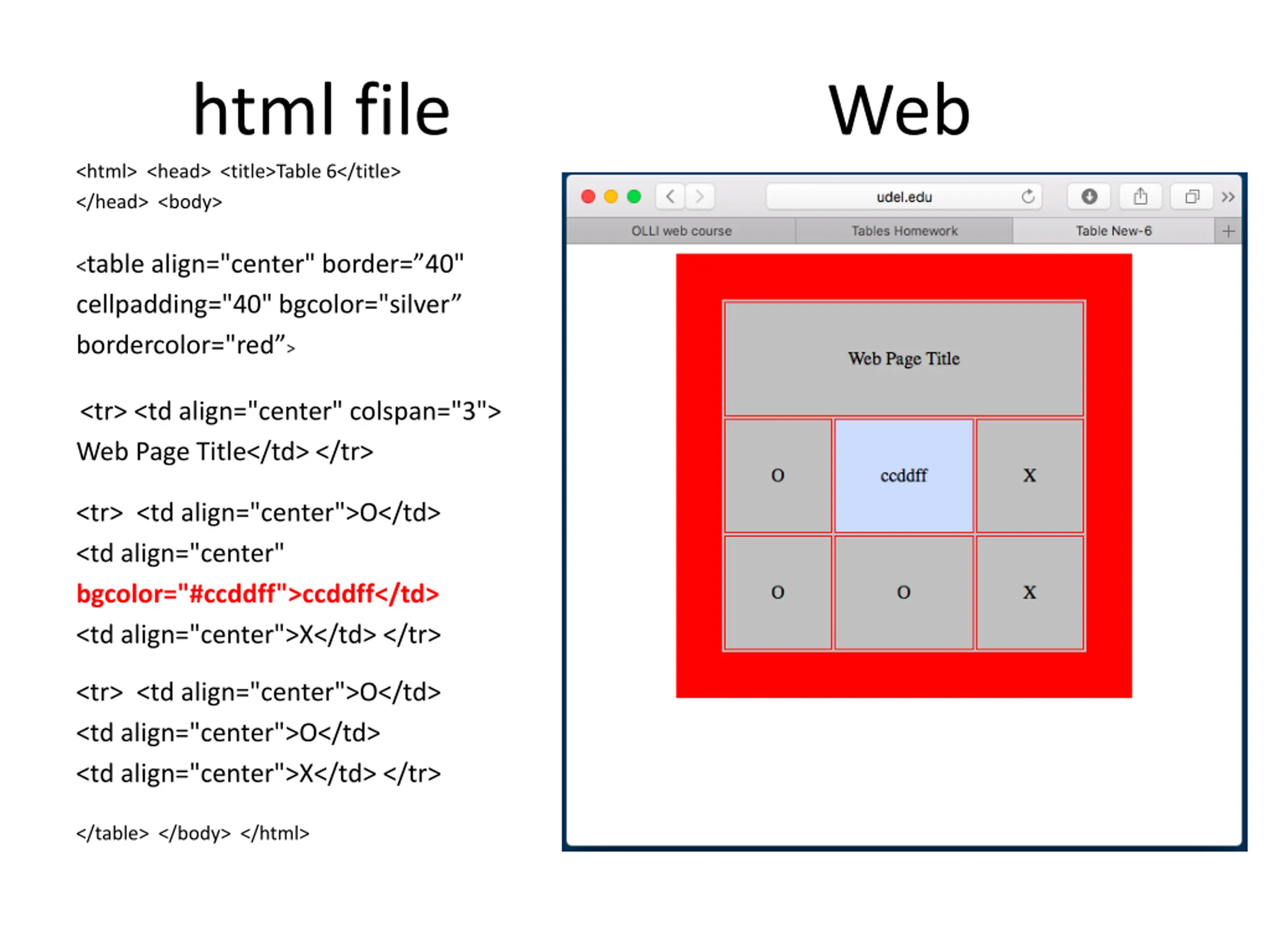 html file <html> <head> <title>Table 6</title> </head> <body> Web <table align="center" border= 40" cellpadding="40" bgcolor="silver bordercolor="red > <tr> <td align="center" colspan="3"> Web Page Title</td> </tr> <tr> <td align="center">O</td> <td align="center" bgcolor="#ccddff">ccddff</td> <td align="center">X</td> </tr> <tr> <td align="center">O</td> <td align="center">O</td> <td align="center">X</td> </tr> </table> </body> </html>