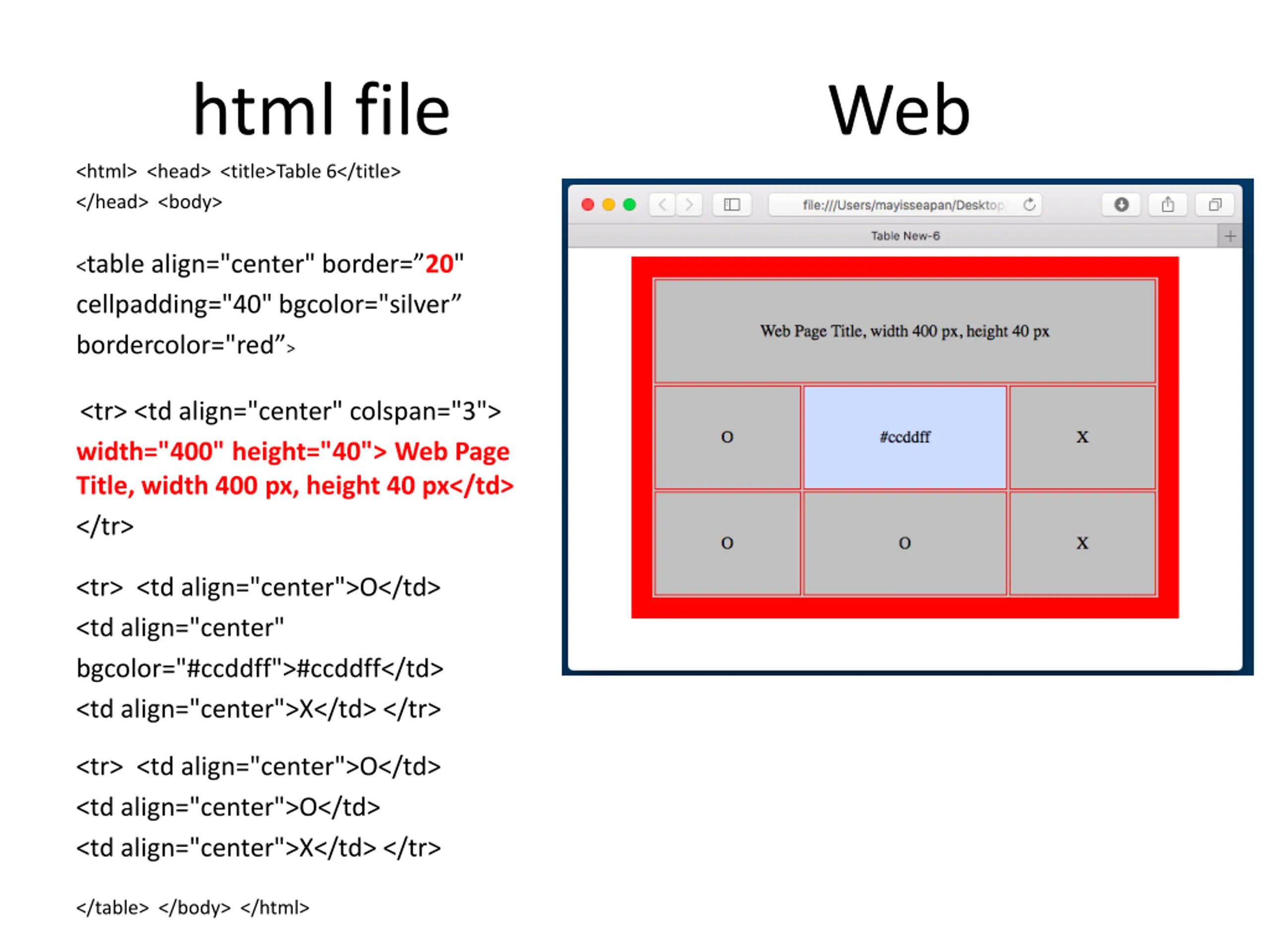 html file <html> <head> <title>Table 6</title> </head> <body> Web <table align="center" border= 20" cellpadding="40" bgcolor="silver bordercolor="red > <tr> <td align="center" colspan="3"> width="400" height="40"> Web Page Title, width 400 px, height 40 px</td> </tr> <tr> <td align="center">O</td> <td align="center" bgcolor="#ccddff">#ccddff</td> <td align="center">X</td> </tr> <tr> <td align="center">O</td> <td align="center">O</td> <td align="center">X</td> </tr> </table> </body> </html>