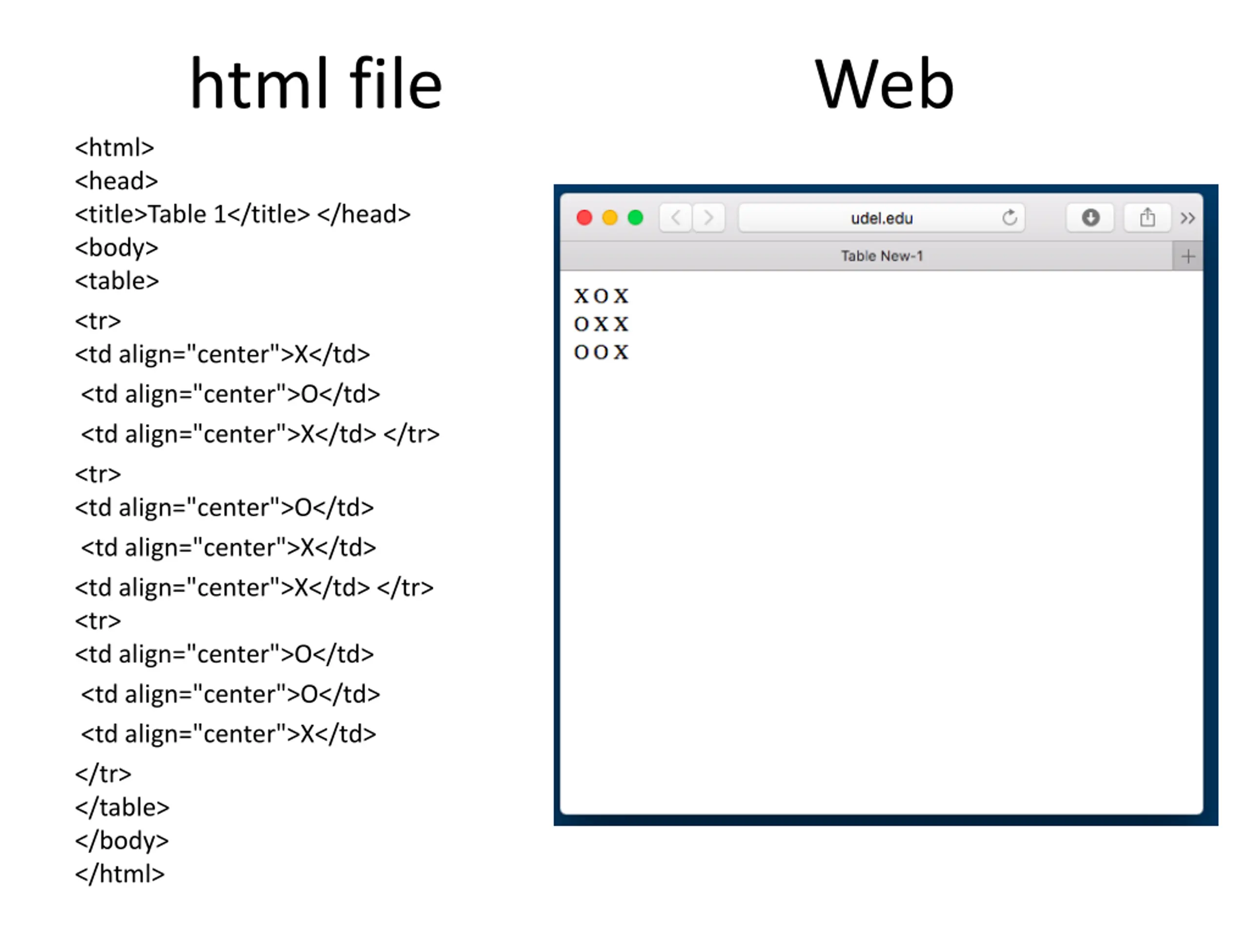 html file Web <html> <head> <title>Table 1</title> </head> <body> <table> <tr> <td align="center">X</td> <td align="center">O</td> <td align="center">X</td> </tr> <tr> <td align="center">O</td> <td align="center">X</td> <td align="center">X</td> </tr> <tr> <td align="center">O</td> <td align="center">O</td> <td align="center">X</td> </tr> </table> </body> </html>