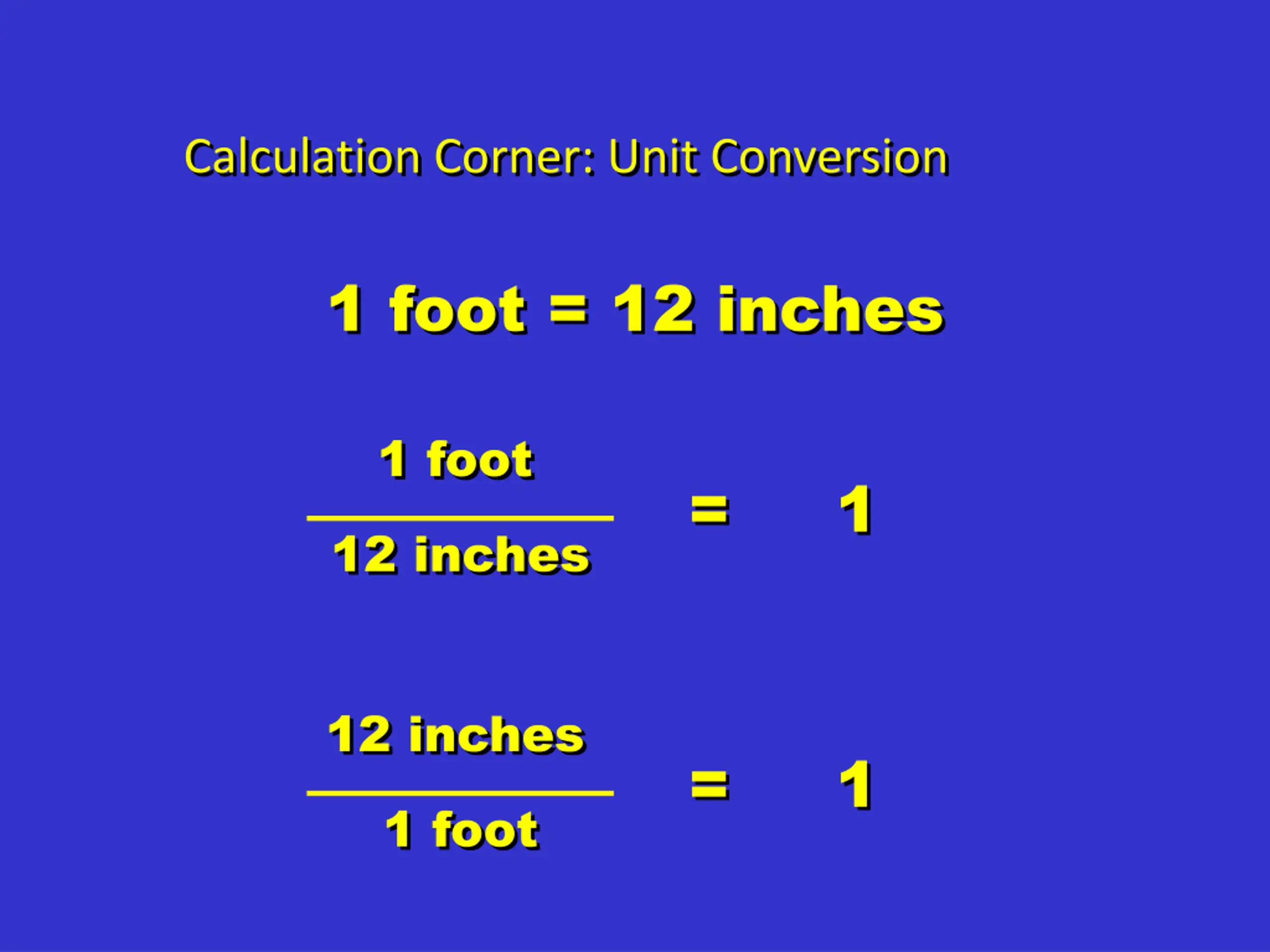 Calculation Corner: Unit Conversion 1 foot = 12 inches 1 foot = 1 12 inches 12 inches = 1 1 foot