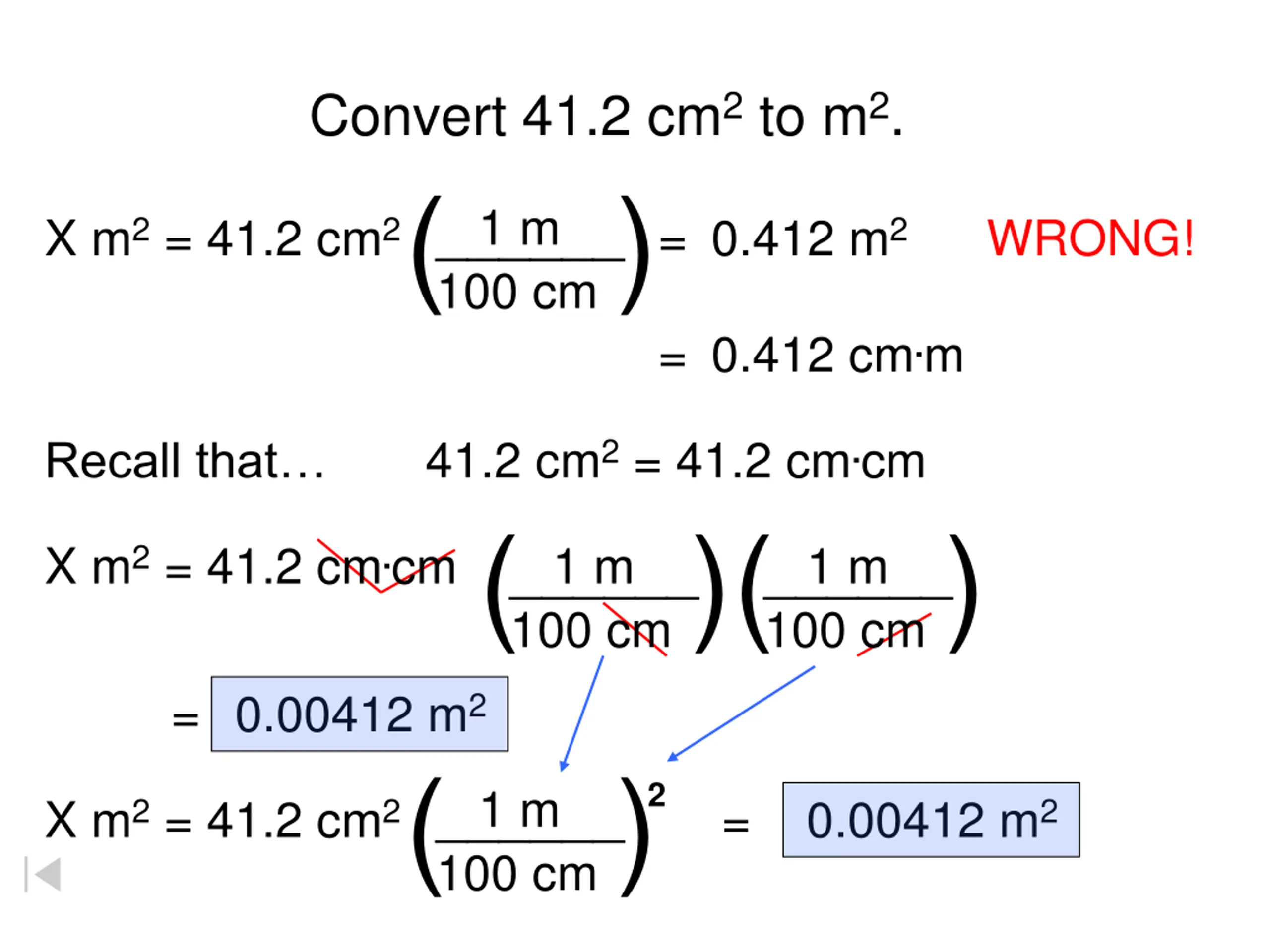 Convert 41.2 cm2 to m2. ( ) ______ 1 m X m2 = 41.2 cm2 = 0.412 m2 WRONG! 100 cm = 0.412 cm.m Recall that 41.2 cm2 = 41.2 cm.cm ( 100 cm ) 100 cm ( ) ______ 1 m ______ X m2 = 41.2 cm.cm 1 m = 0.00412 m2 ( ) 2 ______ 100 cm 1 m X m2 = 41.2 cm2 = 0.00412 m2