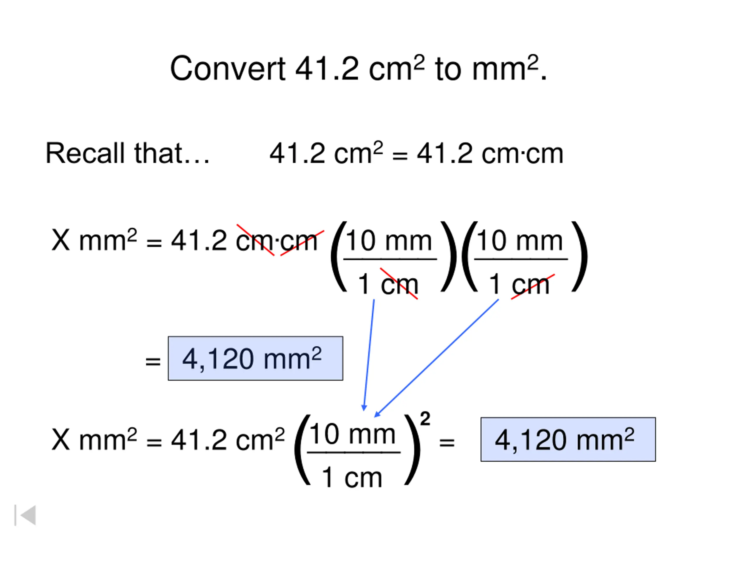 Convert 41.2 cm2 to mm2. Recall that 41.2 cm2 = 41.2 cm.cm ( 10 mm ( ) ) 10 mm _____ _____ X mm2 = 41.2 cm.cm 1 cm 1 cm = 4,120 mm2 10 mm ( ) 2 _____ X mm2 = 41.2 cm2 = 4,120 mm2 1 cm