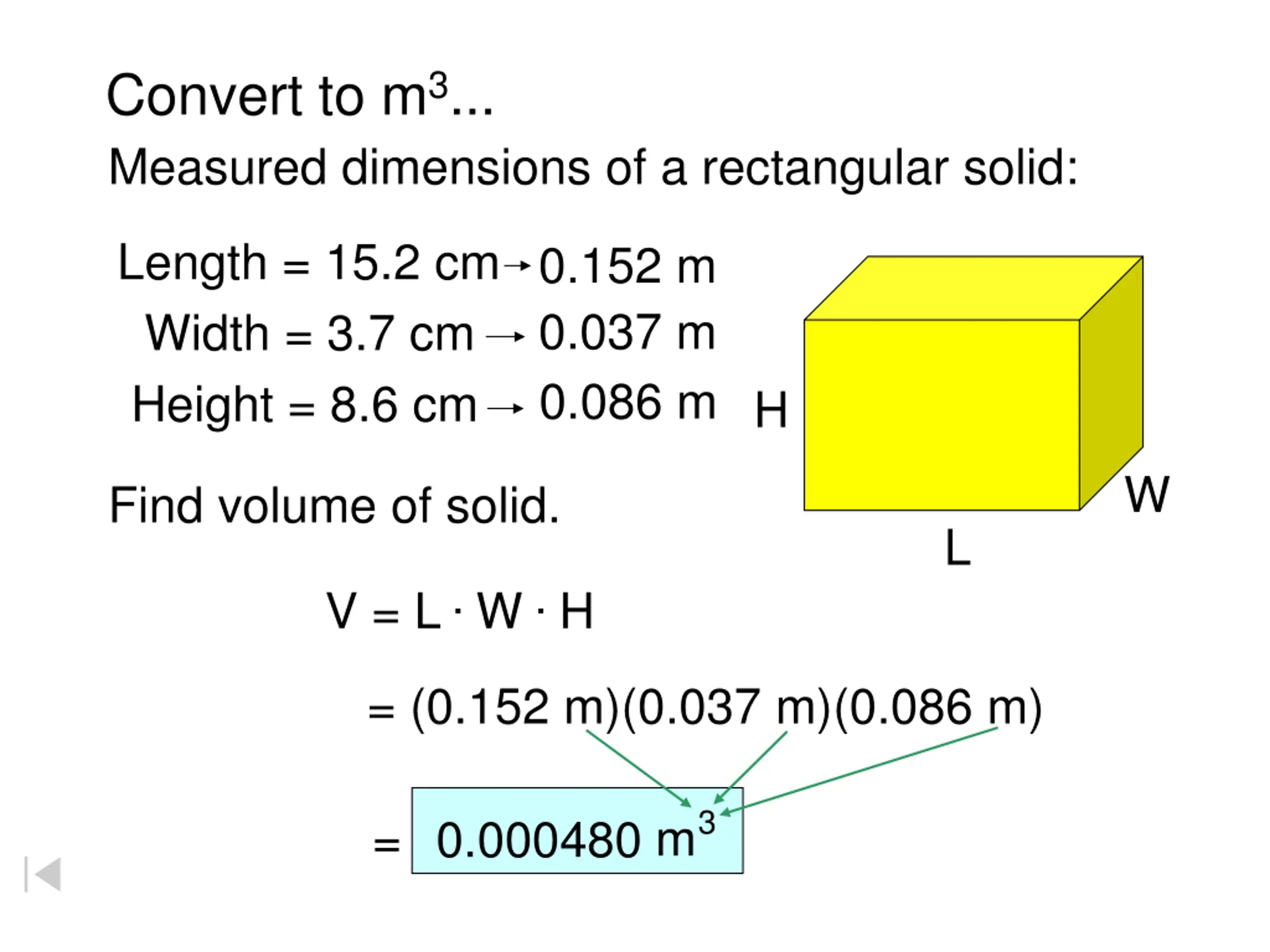 Convert to m3... Measured dimensions of a rectangular solid: Length = 15.2 cm Width = 3.7 cm Height = 8.6 cm 0.152 m 0.037 m 0.086 m H W Find volume of solid. L V = L . W . H = (0.152 m)(0.037 m)(0.086 m) = 0.000480 m3