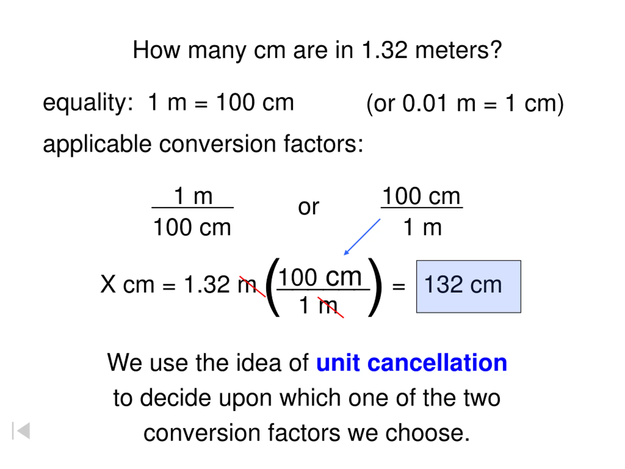 How many cm are in 1.32 meters? equality: 1 m = 100 cm (or 0.01 m = 1 cm) applicable conversion factors: ______ 1 m 100 cm ______ 1 m ) 100 cm or ( 1 m ______ 100 cm X cm = 1.32 m = 132 cm We use the idea of unit cancellation to decide upon which one of the two conversion factors we choose.