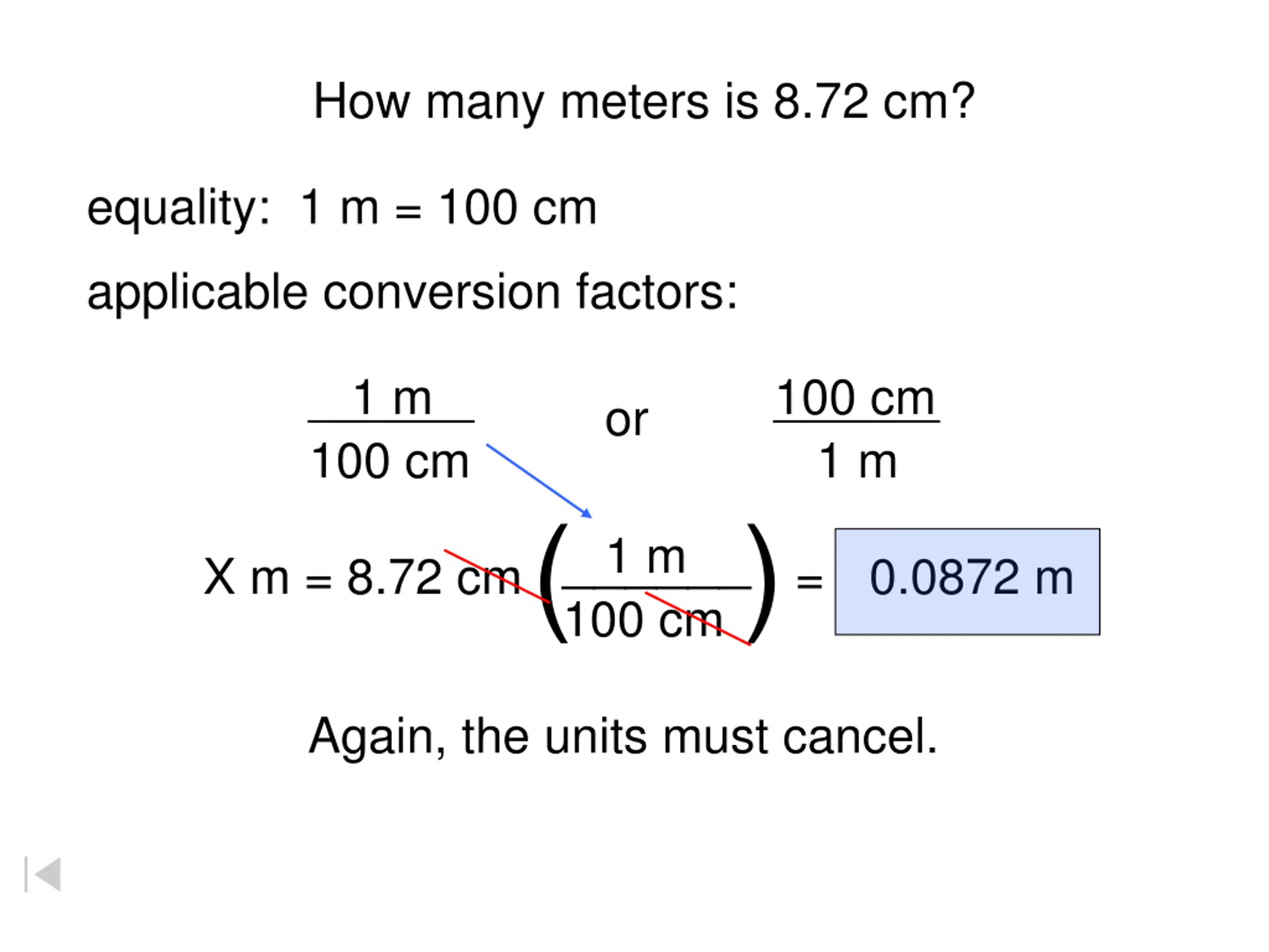 How many meters is 8.72 cm? equality: 1 m = 100 cm applicable conversion factors: ______ 1 m 100 cm ______ 1 m ) 100 cm or ( 1 m ______ 100 cm X m = 8.72 cm = 0.0872 m Again, the units must cancel.