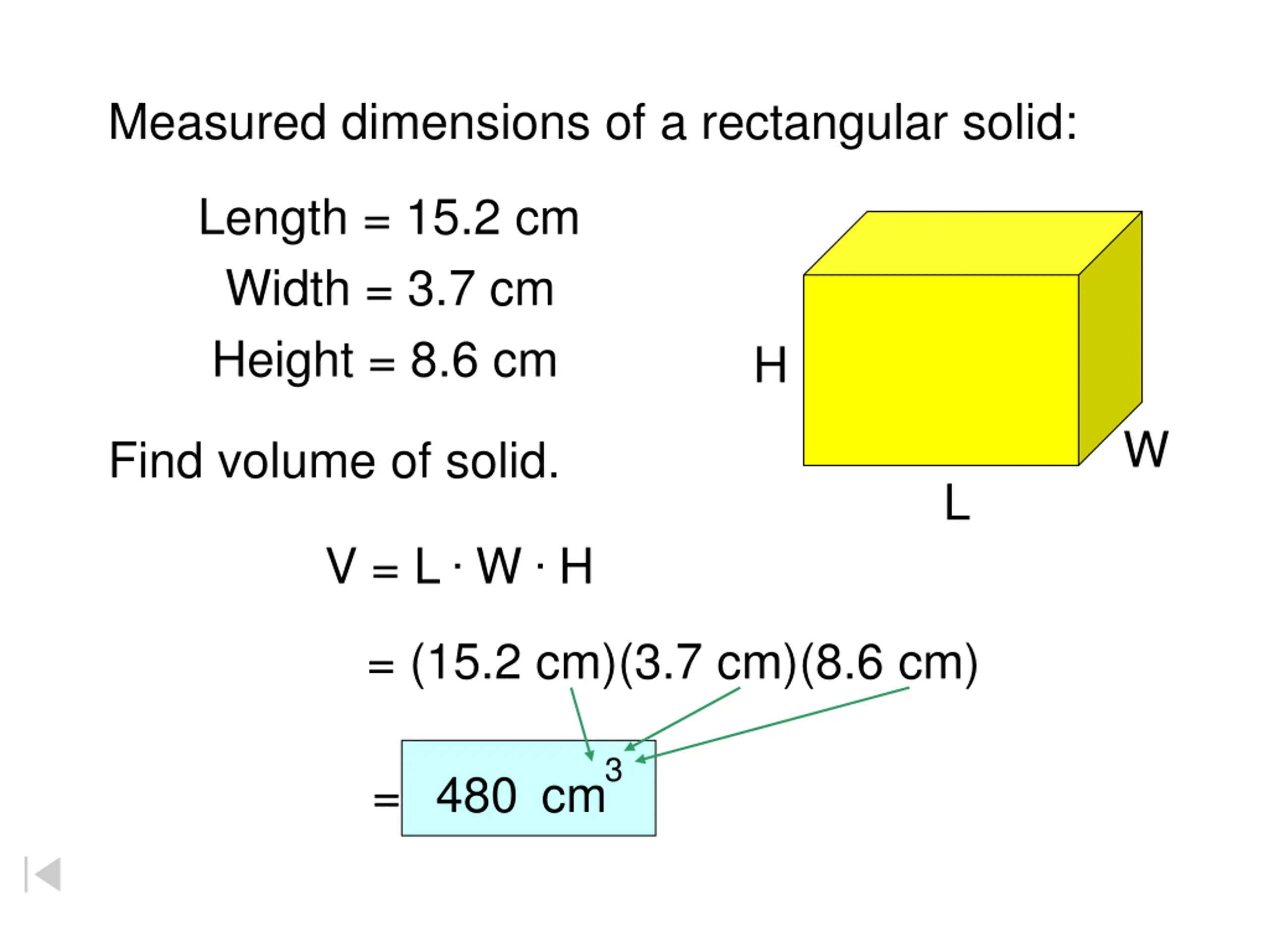 Measured dimensions of a rectangular solid: Length = 15.2 cm Width = 3.7 cm Height = 8.6 cm H W Find volume of solid. L V = L . W . H = (15.2 cm)(3.7 cm)(8.6 cm) 3 = 480 cm