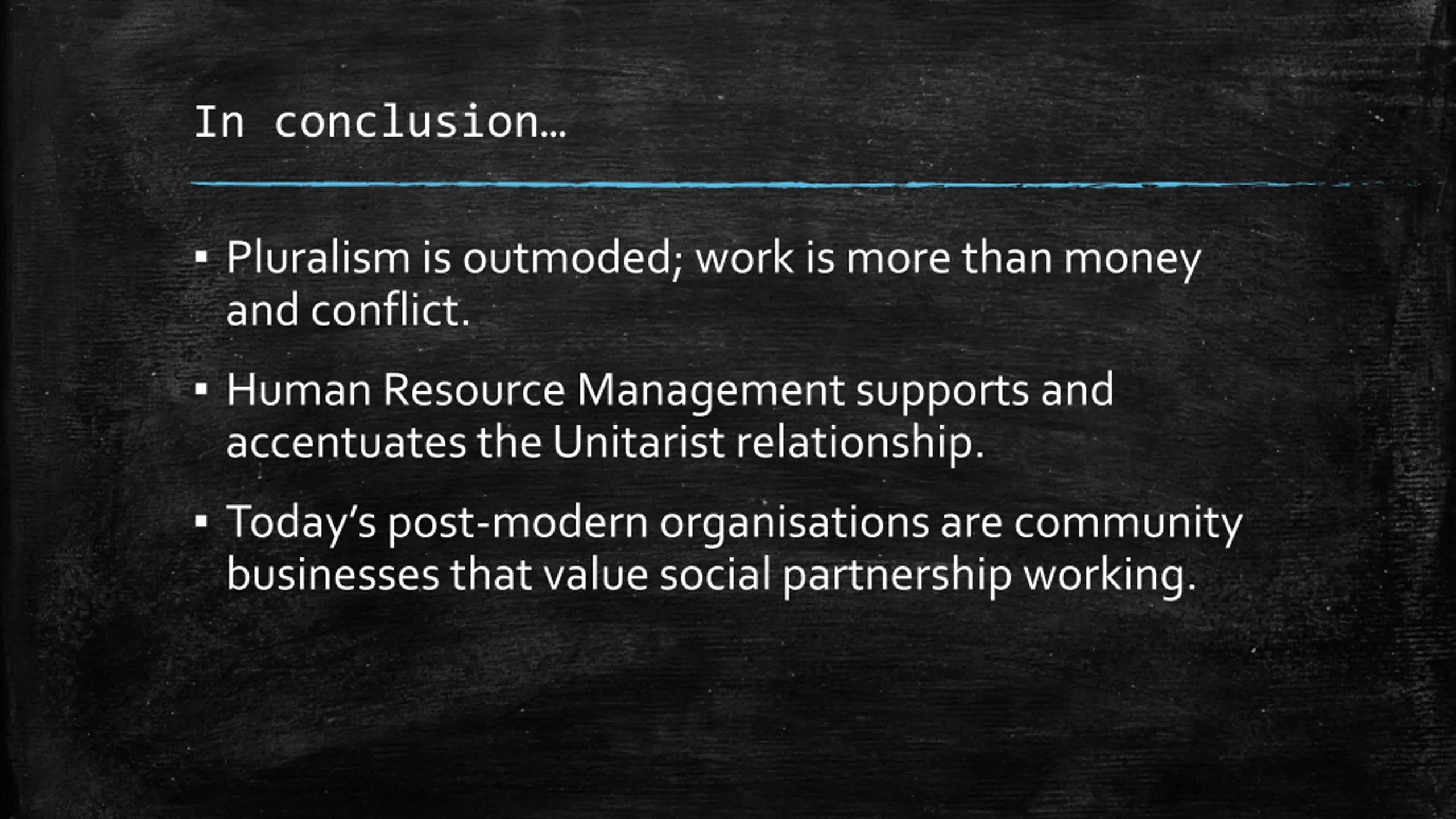 In conclusion Pluralism is outmoded; work is more than money and conflict. Human Resource Management supports and accentuates the Unitaristrelationship. Today s post-modern organisations are community businesses that value social partnership working.