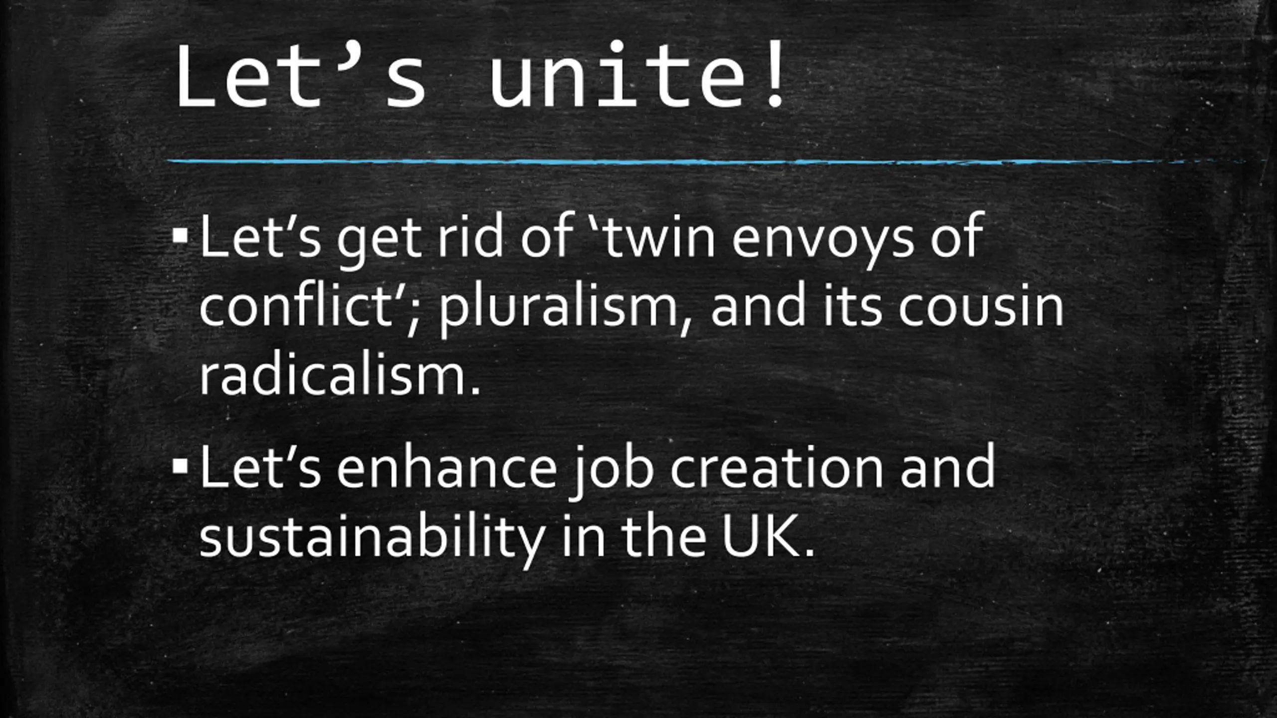 Lets unite! Let s get rid of twin envoys of conflict ; pluralism, and its cousin radicalism. Let s enhance job creation and sustainability in the UK.