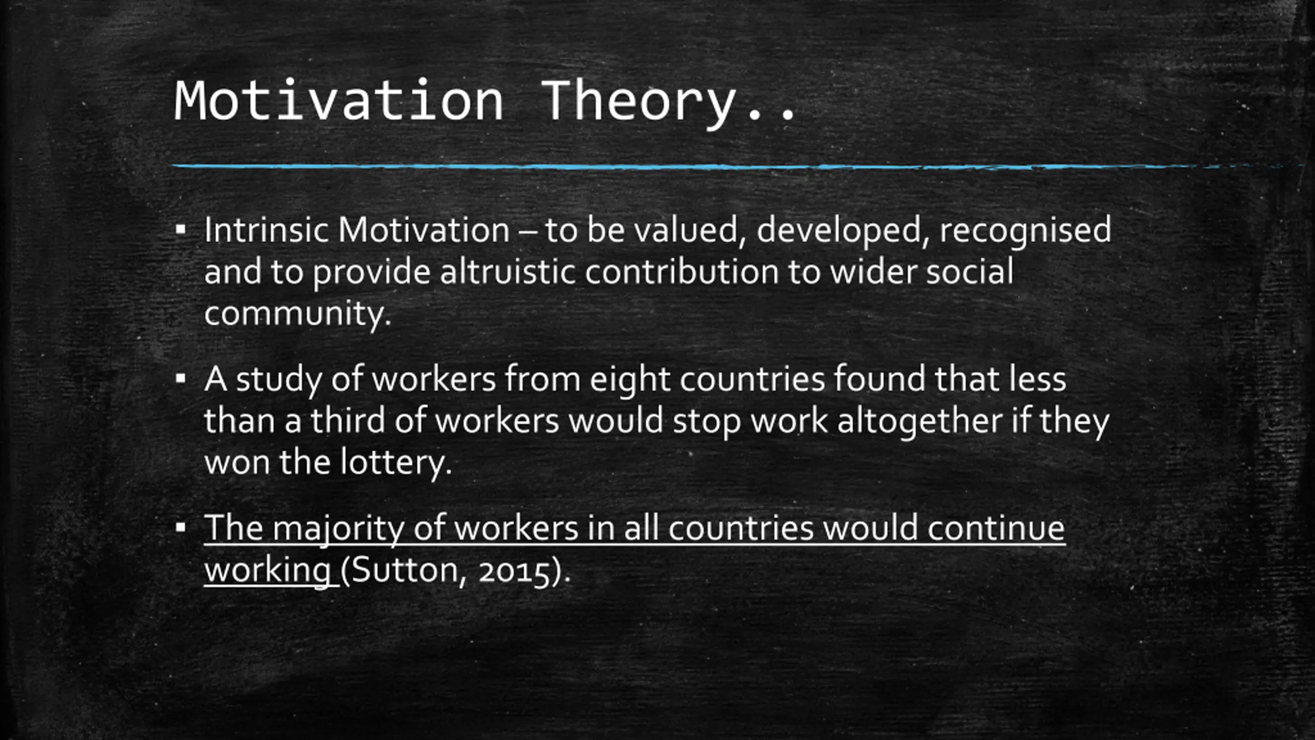 Motivation Theory.. Intrinsic Motivation to be valued, developed, recognised and to provide altruistic contribution to wider social community. A study of workers from eight countries found that less than a third of workers would stop work altogether if they won the lottery. The majority of workers in all countries would continue working (Sutton, 2015).