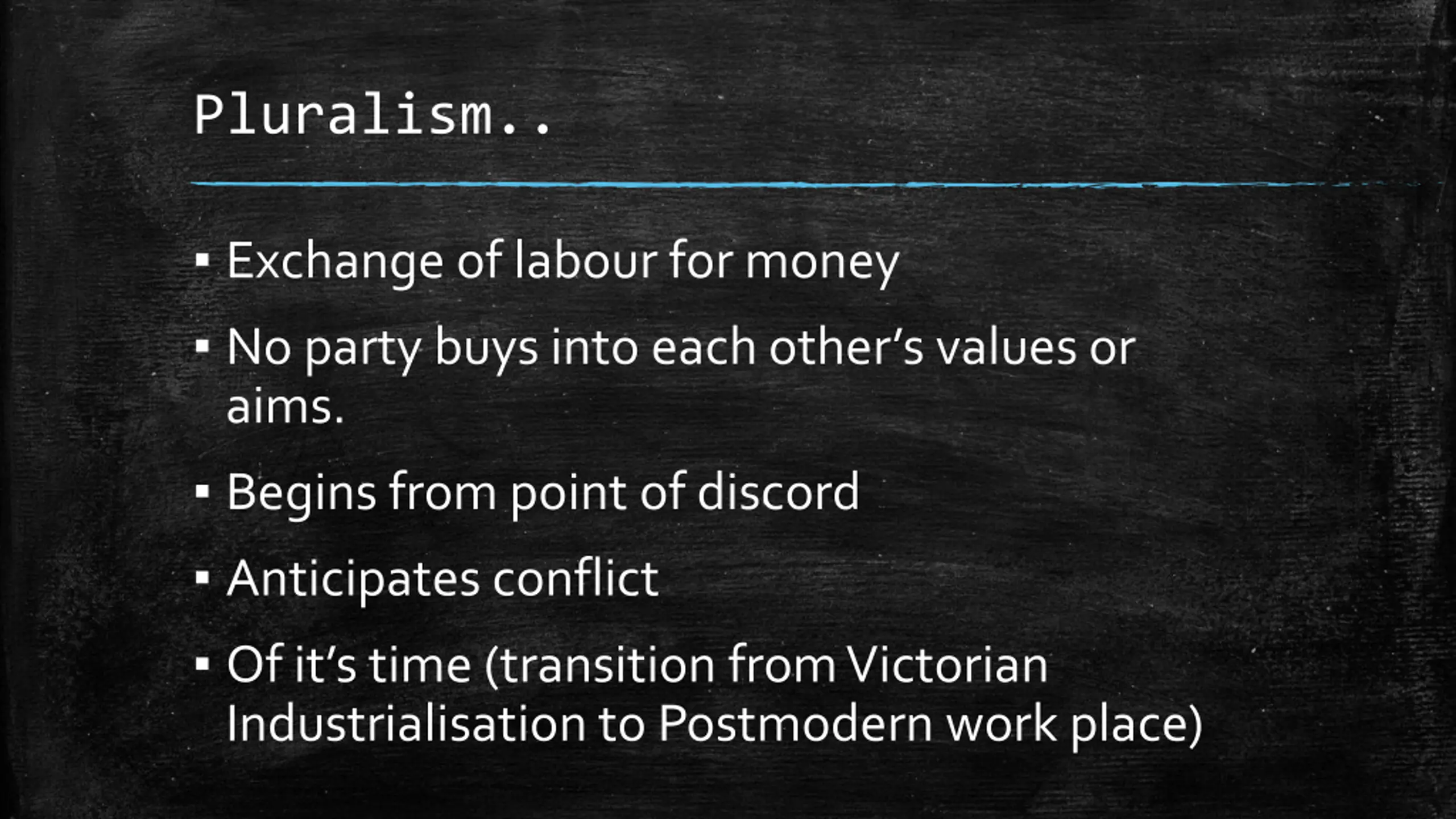 Pluralism.. Exchange of labour for money No party buys into each other s values or aims. Begins from point of discord Anticipates conflict Of it s time (transition from Victorian Industrialisation to Postmodern work place)