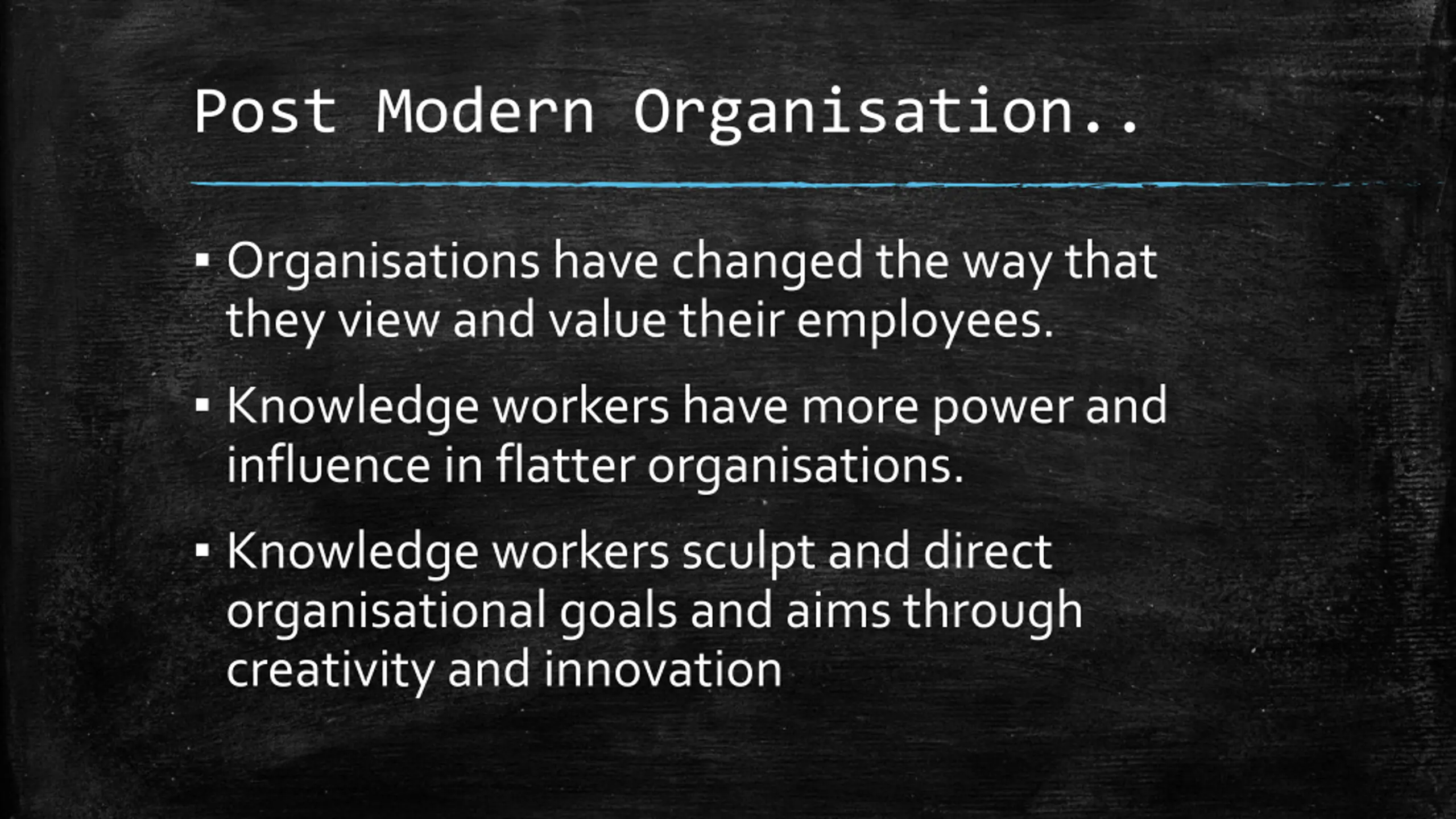 Post Modern Organisation.. Organisations have changed the way that they view and value their employees. Knowledge workers have more power and influence in flatter organisations. Knowledge workers sculpt and direct organisational goals and aims through creativity and innovation