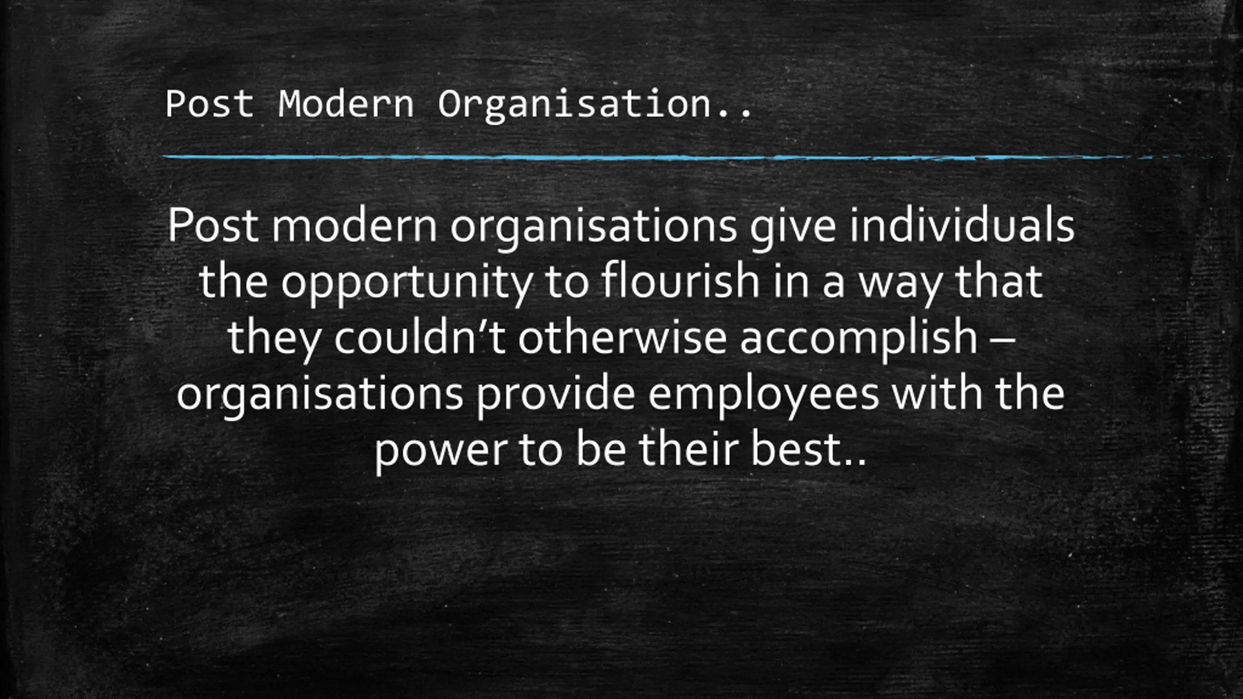 Post Modern Organisation.. Post modern organisations give individuals the opportunity to flourish in a way that they couldn t otherwise accomplish organisations provide employees with the power to be their best..