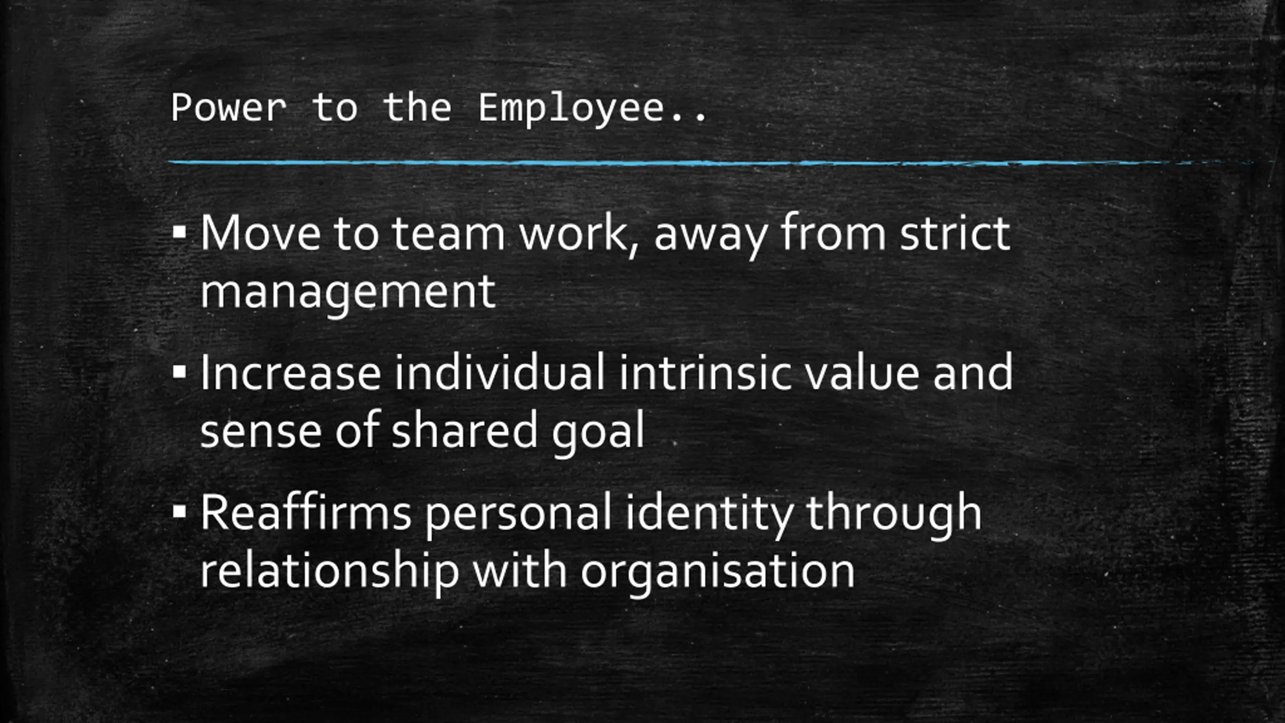 Power to the Employee.. Move to team work, away from strict management Increase individual intrinsic value and sense of shared goal Reaffirms personal identity through relationship with organisation