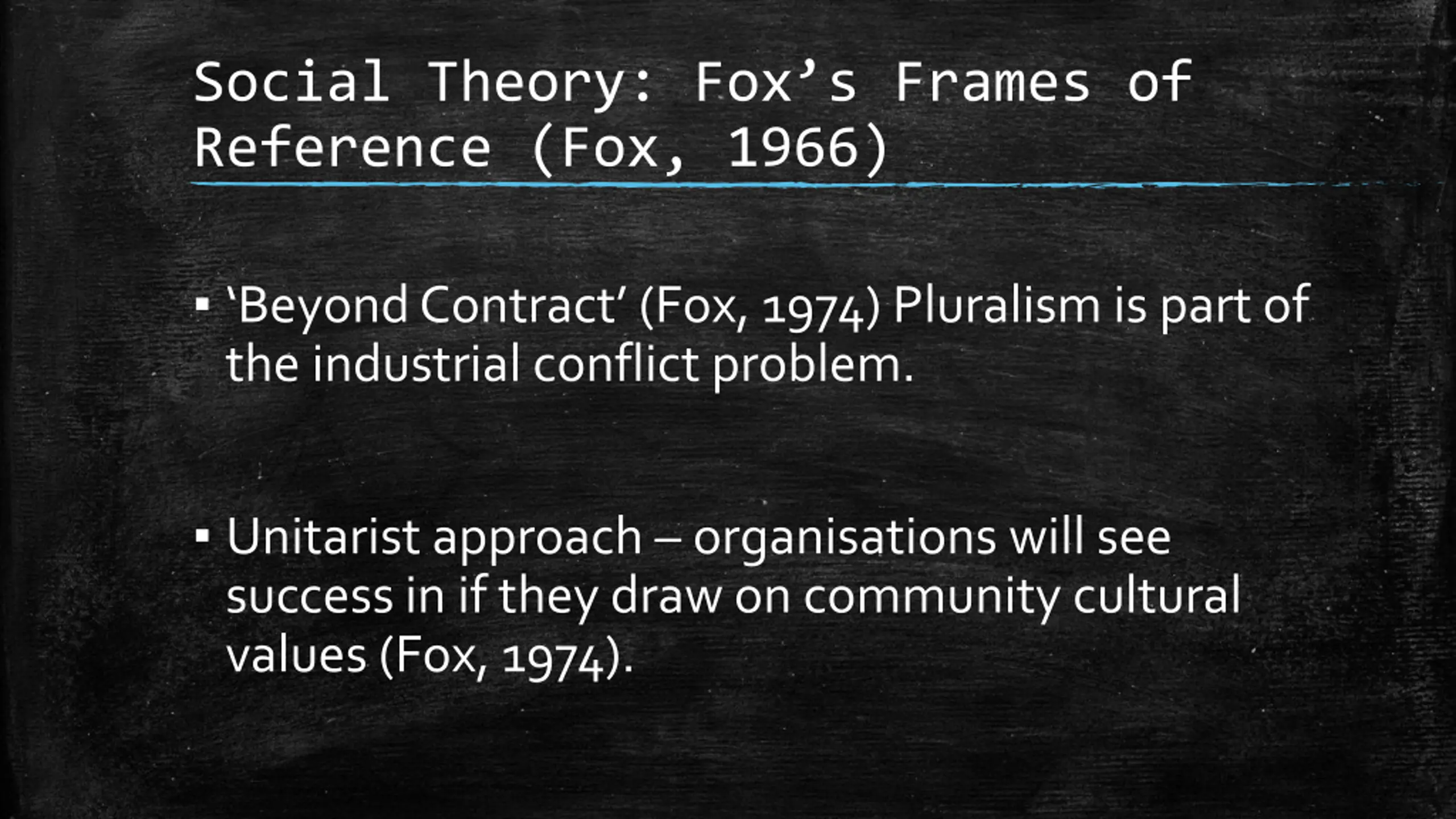 Social Theory: Foxs Frames of Reference (Fox, 1966) Beyond Contract (Fox, 1974) Pluralism is part of the industrial conflict problem. Unitaristapproach organisations will see success in if they draw on community cultural values (Fox, 1974).