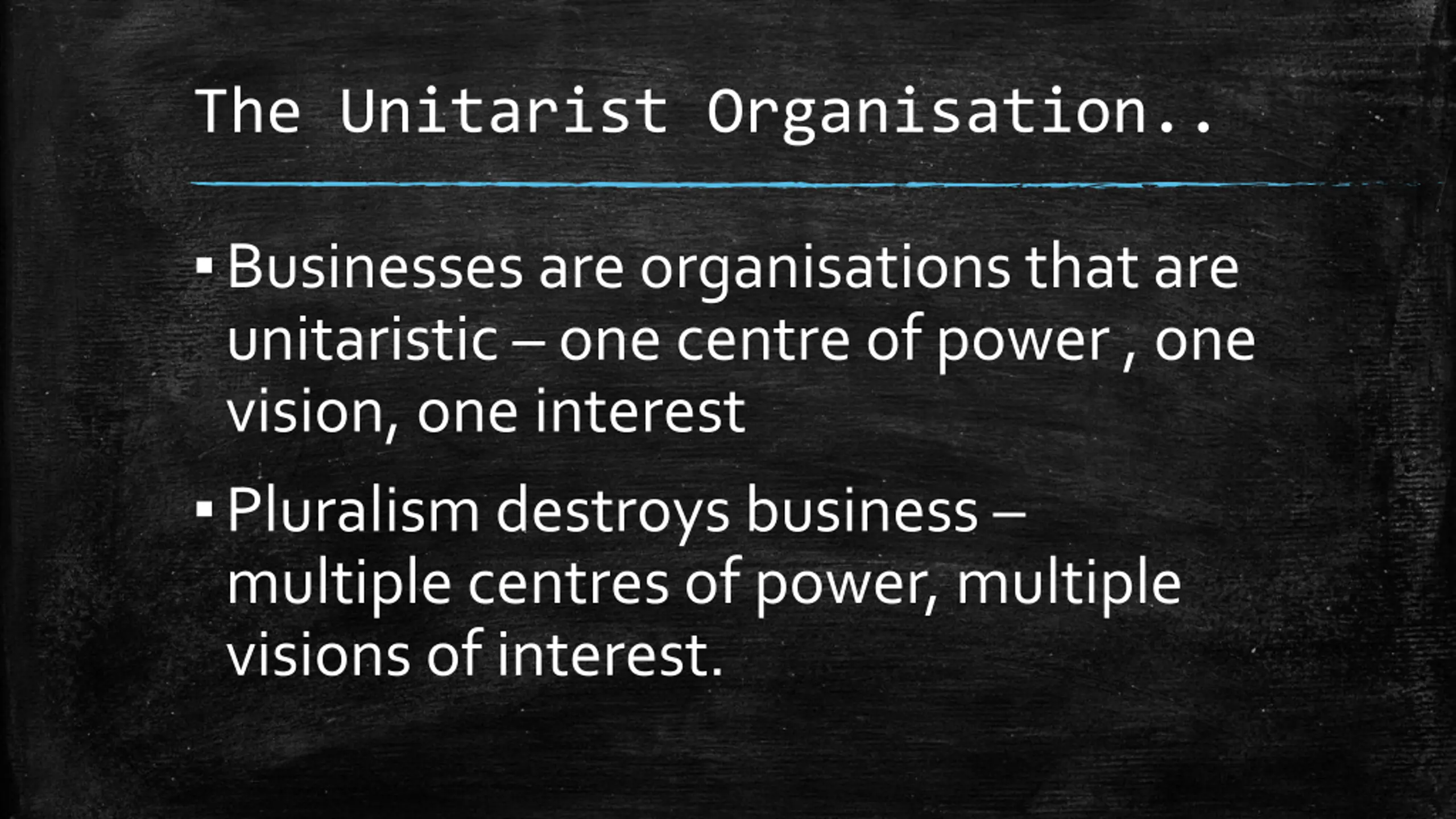 The Unitarist Organisation.. Businesses are organisations that are unitaristic one centre of power , one vision, one interest Pluralism destroys business multiple centres of power, multiple visions of interest.