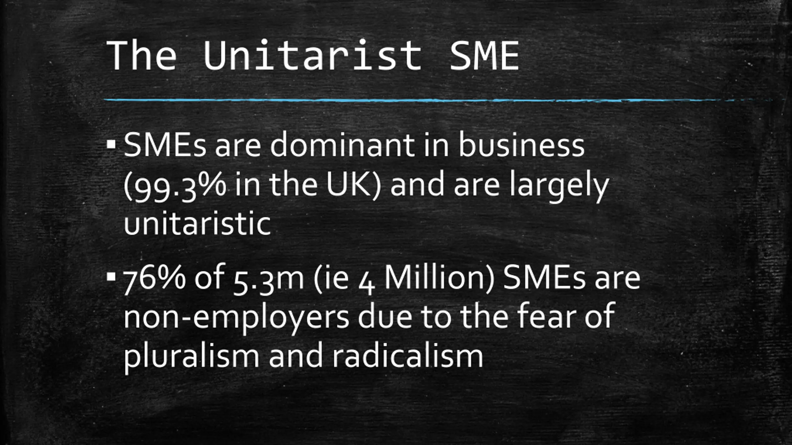 The Unitarist SME SMEs are dominant in business (99.3% in the UK) and are largely unitaristic 76% of 5.3m (ie4 Million) SMEs are non-employers due to the fear of pluralism and radicalism