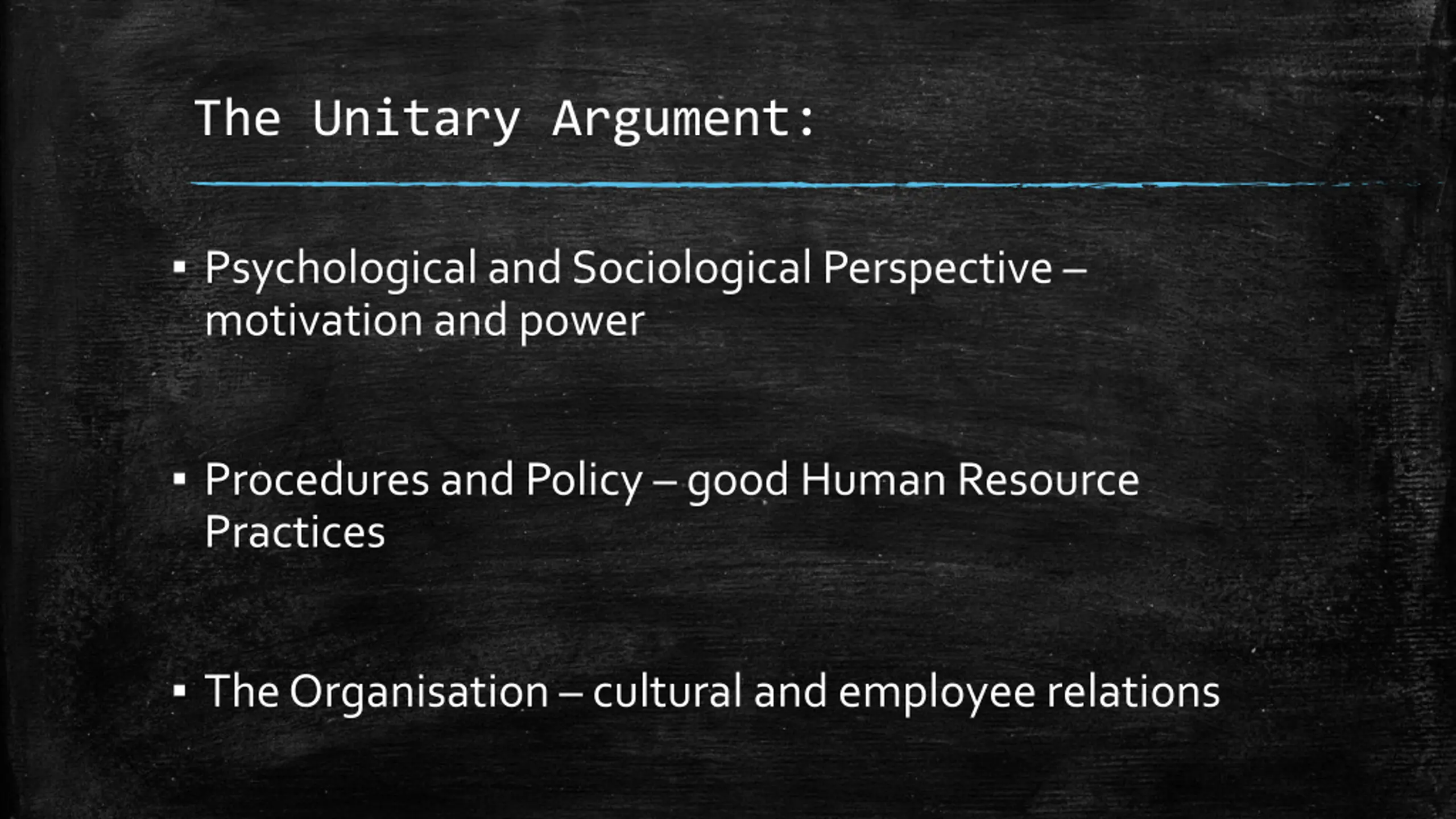 The Unitary Argument: Psychological and Sociological Perspective motivation and power Procedures and Policy good Human Resource Practices The Organisation cultural and employee relations